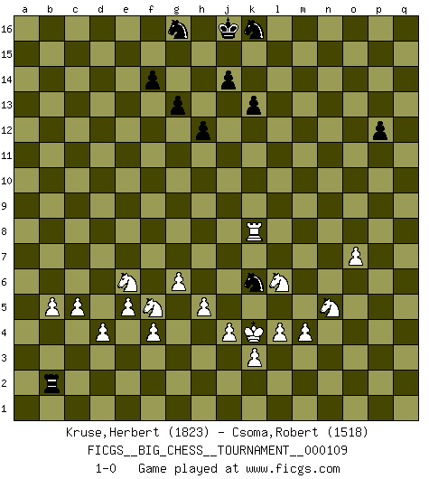 Last move : 1-0 2018 March 12 21:33:4 [Event "FICGS__BIG_CHESS__TOURNAMENT__000109"] [Site "FICGS"] [Date "2018.02.01"] [Round "1"] [White "Kruse,Herbert"] [Black "Csoma,Robert"] [Result "1-0"] [WhiteElo "1823"] [BlackElo "1518"] 1.j2-k4 g15-g13 2.h1-o7 h16-f14 3.h2-g4 o15-o14 4.m2-m4 d15-d14 5.e2-e4 n15-n14 6.e1-e3 o16-d6 7.e4-e5 d6-a9 8.e3-f3 f14-e14 9.d2-d4 h14-h13 10.o7-f7 a9-f14 11.l1-p5 k15-k14 12.c1-l9 h13-h12 13.n2-n3 l16-k15 14.p1-o3 k15-m13 15.o1-g8 p16-n15 16.g8-m13 n15-m13 17.f1-c4 e14-d13 18.f7-d5 d13-d5 19.c4-d5 m13-k12 20.m1-m3 c16-o5 21.m3-l3 o5-k9 22.f3-c3 c15-c14 23.b1-d2 k12-m11 24.l9-m8 f16-m10 25.d2-e4 a15-a13 26.e4-f6 a16-a14 27.d5-e4 k9-e4 28.f6-e4 a14-b14 29.c3-b3 b16-d15 30.l3-l10 m10-o12 31.l10-l11 m11-l13 32.l11-b11 b14-b11 33.b3-b11 d15-c13 34.b11-o11 o12-k8 35.m8-l9 k8-l9 36.p5-l9 f14-e13 37.a1-d1 m15-m13 38.d1-d3 q15-q13 39.d3-a3 b15-b14 40.q2-q4 m16-m14 41.q4-q5 m14-l14 42.l9-j7 l13-n12 43.q5-q6 l14-l7 44.j7-k6 l7-c7 45.c2-c3 c13-d15 46.a3-b3 b14-b13 47.q1-q5 c7-k7 48.k6-j5 a13-a12 49.g4-h6 k7-g7 50.h6-g4 g7-a7 51.a2-a3 p15-p13 52.q5-o5 p13-p12 53.o11-o7 a7-o7 54.o5-o7 q13-q12 55.o7-c7 d15-b16 56.b3-b9 e13-g11 57.c7-p7 o14-o13 58.j5-l7 j15-h13 59.l7-g11 h13-g11 60.k1-l3 e15-e13 61.p7-f7 f15-f14 62.b9-d9 d14-d13 63.g1-f3 e13-e12 64.o3-n5 e16-e13 65.f3-g5 e13-f13 66.f7-f13 g11-f13 67.g4-h6 q12-q11 68.p2-p4 q11-q10 69.p4-p5 q16-q11 70.o2-o4 q11-b11 71.b2-b4 b11-a11 72.j1-h2 a11-a3 73.q6-q7 f13-e11 74.d9-e9 e11-c10 75.e9-e10 c10-d8 76.e10-q10 d8-b9 77.h6-f5 b9-c7 78.f5-e3 c7-b5 79.e3-d5 a12-a11 80.g5-f7 b13-b12 81.f7-d6 b5-d6 82.e4-d6 c14-c13 83.p5-p6 a3-a2 84.f2-f4 a2-a1 85.o4-o5 a1-o1 86.n3-n4 h15-j13 87.q10-f10 b16-d15 88.d6-e8 j13-h11 89.f10-a10 h11-j9 90.n5-m7 j9-l8 91.a10-l10 l8-m6 92.l10-l15 o1-o4 93.l15-d15 m6-n4 94.l3-n4 o4-n4 95.l2-l3 n4-o4 96.o5-o6 n12-m10 97.d15-d13 m10-n8 98.o6-o7 n8-p7 99.d13-c13 o4-p4 100.m7-n5 p4-p2 101.h2-j2 p7-n6 102.c13-c12 n6-o4 103.c12-e12 o4-p6 104.k4-l6 p6-o8 105.e12-b12 o8-q7 106.b12-b11 p2-p9 107.b11-a11 p9-d9 108.c3-c4 d9-d8 109.e8-d6 d8-g8 110.g2-g4 q7-o8 111.a11-n11 g8-a8 112.n11-n14 k14-k13 113.n14-n13 a8-a2 114.j2-k3 a2-d2 115.d6-f5 d2-c2 116.c4-c5 c2-h2 117.h3-h4 h2-g2 118.g4-g5 g2-a2 119.n13-o13 o8-q9 120.o13-m13 a2-a11 121.m13-m9 q9-o8 122.m9-m8 o8-n10 123.m8-n8 n10-l9 124.n8-l8 l9-k7 125.l8-k8 k7-j9 126.k8-j8 j9-h7 127.j8-j7 h7-f8 128.h4-h5 a11-d11 129.d5-c7 f8-h9 130.j7-h7 h9-g11 131.h7-f7 g11-e10 132.b4-b5 e10-g9 133.f7-f9 g9-h7 134.g5-g6 h7-k6 135.j3-j4 d11-a11 136.l3-l4 a11-a1 137.k3-k4 a1-f1 138.c7-e6 f1-f2 139.k2-k3 f2-o2 140.f9-f8 o2-b2 141.f8-k8 1-0 Follow this game move after move (download)Chess, like love, is infectious at any age. (Flohr) Vielleicht wirkt die Aura früherer Spieler glanzvoller als die der heutigen Spieler, aber das liegt daran, dass man kein Programm wie Fritz hatte, das einem all die Löcher in ihren Partien zeigt. (Vladimir Kramnik) Puntos débiles o agujeros en la posición de tu oponente deben de ser ocupados por piezas, no Peones. (Siegbert Tarrasch) Je fais ceci parce que dans cinquante coups j'obtiendrai cela; je m'appelle Mikhail Moisevitch Botvinnik. (Botvinnik) Whoever said the pen is mightier than the sword obviously never encountered automatic weapons. (US General Douglas MacArthur)