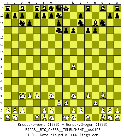 Last move : 1-0 2018 March 14 5:8:8 [Event "FICGS__BIG_CHESS__TOURNAMENT__000109"] [Site "FICGS"] [Date "2018.02.01"] [Round "1"] [White "Kruse,Herbert"] [Black "Gorsek,Gregor"] [Result "1-0"] [WhiteElo "1823"] [BlackElo "1293"] 1.j2-k4 k16-l14 2.h1-o7 j15-h13 3.o7-o15 p16-o14 4.o15-c4 k15-k13 5.h2-g4 b16-c14 6.m2-m4 n15-n13 7.l1-o4 d15-d14 8.d2-d4 j14-j13 9.c1-k8 m15-m13 10.n2-n3 l16-n14 11.e2-e4 1-0 This big chess game has been lost on time (started : 2018.02.01 17:1:46) Follow this game move after move (download)Good positions don't win games, good moves do. (Gerald Abrahams) Ein guter Spieler hat immer Glück. (José Raúl Capablanca) Tu sabes, camarada Pachman, no disfruto el ser un Ministro, preferería jugar al Ajedrez como tu. (Che Guevara) En blitz, le Cavalier l'emporte sur le Fou. (Vlastimil Hort) Question: Is 'This statement is paradoxical' a paradoxical statement ? Or is it a meta-paradox ? (Normajean Yates)