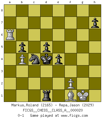 Last move : 0-1 2007 July 2 21:51:15 [Event "FICGS__CHESS__CLASS_A__000020"] [Site "FICGS"] [Date "2007.04.23"] [Round "1"] [White "Markus,Roland"] [Black "Repa,Jason"] [Result "0-1"] [WhiteElo "2165"] [BlackElo "2029"] 1.d4 e6 2.c4 Nf6 3.g3 d5 4.Bg2 dxc4 5.Nf3 a6 6.O-O Nc6 7.Nc3 Rb8 8.e4 Be7 9.d5 exd5 10.exd5 Nb4 11.Ne5 Bf5 12.a3 Nd3 13.Nxc4 O-O 14.Be3 Qd7 15.b4 Rfe8 16.Ra2 Bd6 17.Nxd6 cxd6 18.Bd4 Rbc8 19.Bxf6 gxf6 20.Ne2 Bg6 21.Rd2 Qb5 22.Qa1 Ne5 23.Nf4 Rc4 24.Rc1 Rxc1+ 25.Qxc1 Qc4 26.Rd1 Rc8 27.Qxc4 Rxc4 28.Ra1 Rc2 29.h3 Kg7 30.h4 Rc3 31.Ne2 Rd3 32.Nf4 Rb3 33.Bh3 Bb1 34.Bg2 f5 35.Ne2 Kf6 36.Nd4 Rb2 37.Ne2 Nc4 38.Bf1 Nd2 39.Nc3 Nf3+ 40.Kg2 Be4 41.Nxe4+ fxe4 42.Rc1 Nd4 43.Rc4 Rd2 44.Rc3 b5 45.g4 Ke5 46.Rc7 f5 47.gxf5 Kf6 48.Rc3 Nxf5 49.Rc8 Ke5 50.Re8+ Kxd5 51.Rf8 Ke5 52.Re8+ Kf4 53.Kg1 Nxh4 54.Rf8+ Ke5 55.Re8+ Kd4 56.Bh3 Rd1+ 57.Bf1 Nf3+ 58.Kg2 Ne1+ 59.Kg1 Nc2 60.Rc8 Nxa3 61.Rc6 d5 62.Rxa6 Nc4 0-1 Queen's pawn Kingside Castling by player White (move 6) Kingside Castling by player Black (move 13) Player Black won this chess game. Follow this game move after move (download)There is only one thing Fischer does in Chess without pleasure: to lose ! (Boris Spassky) Zum Sieg gelangt man nicht, wenn man gut, sondern nur wenn man besser spielt (Savielly Grigorievitsch Tartakower) El Ajedrez es tortura mental. (Garry Kasparov) On peut tirer plus d'utilité d'une partie perdue que de 100 parties gagnées. (Capablanca) If you have any trouble condescending, find a Unix user to show you how it's done. (Scott Adams)