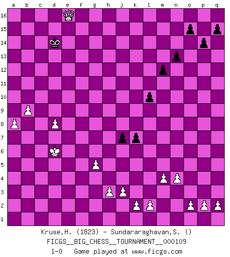 Last move : 1-0 2018 February 5 5:24:35 [Event "FICGS__BIG_CHESS__TOURNAMENT__000109"] [Site "FICGS"] [Date "2018.02.01"] [Round "1"] [White "Kruse,Herbert"] [Black "Sundararaghavan,Shailesh"] [Result "1-0"] [WhiteElo "1823"] [BlackElo ""] 1.j2-k4 m15-m13 2.h1-o7 h15-g13 3.e2-e4 l16-n14 4.f1-c4 j15-g14 5.d2-d3 h16-l13 6.h2-g4 l13-h13 7.c4-k11 h13-h10 8.k11-g14 f15-g14 9.o7-g14 k16-h15 10.g14-e16 b16-c14 11.e16-p6 h10-c10 12.b1-c3 c10-c7 13.k1-h2 p15-p14 14.p6-f6 m13-m12 15.c1-f4 c7-j13 16.m2-m4 e15-e13 17.l1-q6 j13-j11 18.f4-d6 j11-l9 19.f6-l6 l9-q9 20.n2-n4 f16-a11 21.o1-l4 q9-j9 22.d6-e5 j9-e9 23.e1-e3 o16-q14 24.e3-f3 m16-m14 25.f3-f9 e9-e6 26.l6-e6 n14-e6 27.m1-m3 n15-n13 28.m3-p3 q14-g5 29.p3-p6 e6-k11 30.p6-k6 m14-k14 31.f9-k9 k11-j10 32.k9-k14 h15-k14 33.l4-n6 d15-d13 34.n6-j10 c16-j10 35.p1-o3 p16-n15 36.e5-f6 g5-f6 37.g4-f6 a16-f16 38.h2-g4 n15-m13 39.q1-m1 j10-l8 40.m1-m3 l8-g4 41.f6-g4 j16-j15 42.m3-l3 q16-l16 43.a1-e1 f16-f12 44.e1-e3 a11-b12 45.e3-f3 f12-j12 46.g1-j2 c14-d12 47.l3-l6 d12-f11 48.k6-j6 j12-g12 49.j6-g6 g12-h12 50.q6-p5 h12-h13 51.f3-f5 e13-e12 52.f5-h5 h13-j13 53.g6-j6 j13-j6 54.k4-j6 g13-j12 55.p5-m8 b12-d10 56.m8-j5 d10-b8 57.j5-g3 b8-e11 58.j1-h1 g16-f14 59.g3-k6 e11-k6 60.l6-k6 h14-h13 61.h5-a5 a15-a14 62.j6-h8 g15-g13 63.k6-b6 l16-b16 64.a5-a14 b15-b14 65.a14-a15 f14-e16 66.a2-a4 j15-h14 67.a4-a5 f11-d12 68.b6-a6 h14-j13 69.a15-a16 b16-a16 70.a6-a16 e16-g15 71.a16-c16 c15-c13 72.c16-d16 d12-e14 73.d16-d13 j12-g11 74.a5-a6 b14-b13 75.d13-d15 g11-f13 76.d15-b15 b13-b12 77.b2-b4 k14-h15 78.b4-b5 h15-f16 79.c3-d5 f13-d12 80.d5-e7 k15-k13 81.c2-c4 d12-c14 82.e7-d9 j13-h14 83.b15-b14 e14-d16 84.d9-f10 e12-e11 85.f10-d11 f16-d15 86.b14-b13 g15-e14 87.h8-f9 e14-d12 88.b13-c13 d15-c13 89.d11-c13 e11-e10 90.f9-e11 h14-g14 91.c13-d11 d16-e14 92.g4-f6 g13-g12 93.j2-h4 b12-b11 94.h4-g6 g14-g13 95.g6-f8 h13-h12 96.d11-c9 h12-h11 97.c9-e10 d12-e10 98.f8-e10 e14-c13 99.o3-n5 c13-d11 100.n5-l6 m13-l11 101.l6-j7 l11-j10 102.j7-h9 k13-k12 103.f6-e8 d11-f12 104.e10-f12 g13-f12 105.e11-d9 c14-d12 106.f2-f4 f12-f11 107.d9-f8 g12-g11 108.g2-g4 j14-j13 109.h1-g2 l15-l13 110.g2-f3 l13-l12 111.c4-c5 l12-l11 112.d3-d4 g11-g10 113.h9-g7 j13-j12 114.d4-d5 k12-k11 115.b5-b6 g10-g9 116.f8-d7 h11-h10 117.c5-c6 j10-g11 118.a6-a7 j12-j11 119.b6-b7 j11-j10 120.a7-a8 f11-e10 121.c6-c7 b11-b10 122.c7-c8 d12-b11 123.b7-b8 k11-k10 124.c8-c9 b10-c9 125.e8-c9 b11-c9 126.d7-c9 e10-d9 127.g7-e8 g11-e12 128.d5-d6 d9-c8 129.b8-b9 e12-c11 130.d6-d7 c8-b8 131.e4-e5 b8-a9 132.e5-e6 c11-d9 133.f4-f5 g9-g8 134.f3-e4 a9-b10 135.e4-e5 h10-h9 136.f5-f6 j10-j9 137.e6-e7 g8-g7 138.g4-g5 h9-h8 139.d7-d8 b10-a9 140.e5-d6 j9-j8 141.f6-g7 h8-g7 142.e8-g7 k10-k9 143.e7-e8 d9-f10 144.e8-e9 f10-d9 145.e9-e10 a9-b10 146.g7-f9 j8-j7 147.e10-e11 d9-f10 148.f9-g11 k9-k8 149.e11-e12 k8-k7 150.e12-e13 f10-g12 151.e13-e14 g12-f14 152.e14-e15 l11-l10 153.g11-f13 f14-e16 154.c9-d11 b10-c11 155.d11-e13 c11-b12 156.e13-f15 b12-c13 157.f15-d14 e16-d14 158.f13-d14 c13-d14 159.e15-e16 1-0 Follow this game move after move (download)As one by one I mowed them down, my superiority soon became apparent. (Jose Capablanca) Frage des Reporters: -Welche besonderen Umstände rechtfertigen das Anhalten der Uhren während einer Turnierpartie? Antwort: -Einen Fotographen zu strangulieren. (Siegbert Tarrasch) Cuando tengo las piezas blancas, yo gano porque soy blanco; Cuando tengo las piezas negras, yo gano porque soy Bogolyubov. (Bogolyubov) Le succès, c'est être capable d'aller d'échec en échec sans perdre son enthousiasme. (Winston Churchill) The difference between perseverance and obstinacy is that one comes from a strong will, and the other from a strong won't. (Henry Ward Beecher)
