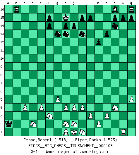 Last move : 0-1 2018 March 19 0:1:4 [Event "FICGS__BIG_CHESS__TOURNAMENT__000109"] [Site "FICGS"] [Date "2018.02.01"] [Round "1"] [White "Csoma,Robert"] [Black "Pipac,Darko"] [Result "0-1"] [WhiteElo "1518"] [BlackElo "1575"] 1.g2-g4 j15-k13 2.h1-f3 h15-g13 3.n2-n3 k16-h15 4.o1-g8 p16-o14 5.f3-c6 h16-l13 6.l2-l3 e15-e13 7.c6-c15 b16-c14 8.g8-c12 l13-c5 9.c12-d13 c5-f2 10.g1-f3 f2-c5 11.c2-c3 c5-c13 12.d13-c14 d15-c14 13.d2-d3 f16-d14 14.c15-c16 a16-c16 15.q2-q4 m15-m13 16.q4-q5 n15-n13 17.c1-e3 c13-e11 18.e3-d4 e11-b11 19.j3-j4 b11-b2 20.b1-d2 m13-m12 21.c3-c4 b2-a3 22.k2-k4 a3-h10 23.l1-f6 l16-p12 24.h3-h4 g16-j15 25.f1-h3 h10-h11 26.f6-h8 h11-p4 27.p1-q3 p4-p2 28.h8-a15 p12-l8 29.q3-o4 p2-o2 30.d4-h8 c14-c13 31.a1-b1 e16-e15 32.b1-b13 h15-f14 33.a15-c13 d14-c13 34.h8-c13 e15-c15 35.c13-d14 c15-c5 36.d14-e13 c5-a5 37.e1-a1 o2-o3 38.d2-b3 a5-a8 39.g4-g5 o3-e12 40.e2-e4 e12-d11 41.b13-b5 d11-d3 42.h3-g2 j16-h15 43.e13-f14 g15-f14 44.b5-b15 d3-e2 45.g2-h1 l8-k7 46.b15-b14 k7-q1 47.m1-q1 a8-a2 48.a1-a2 e2-a2 49.b3-d2 j15-h13 50.q1-p1 c16-b16 51.b14-b16 m16-b16 0-1 Follow this game move after move (download)Chess is 99 percent tactics. (Teichmann) Das Schach ist nichts für kleine Geister, es beansprucht einen vollen Mann, der sich nicht sklavisch an das Überlieferte hält, sondern selbständig die Tiefen des Spiels zu ergründen sucht. (Wilhelm Steinitz) A la fecha, Fischer esta simplemente un nivel arriba de todos los mejores jugadores de Ajedrez del mundo. (John Jacobs) Avec des compensations pour le matériel en plus... (Anonyme) He who is a good ruler must first have been ruled. (Aristotle)