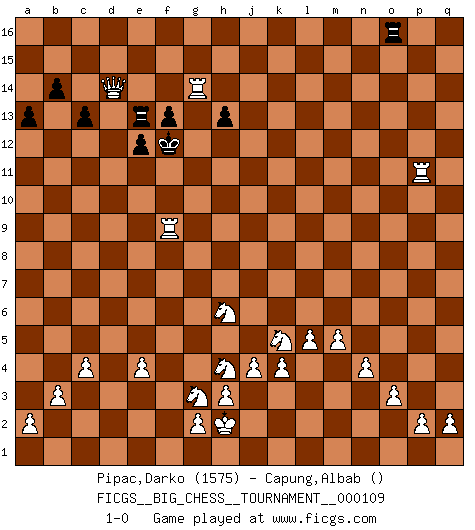 Last move : 1-0 2018 March 28 6:47:2 [Event "FICGS__BIG_CHESS__TOURNAMENT__000109"] [Site "FICGS"] [Date "2018.02.01"] [Round "1"] [White "Pipac,Darko"] [Black "Capung,Albab"] [Result "1-0"] [WhiteElo "1575"] [BlackElo ""] 1.j2-k4 p15-p14 2.h2-g4 o16-p15 3.h1-o7 o15-o13 4.b1-c3 g15-g14 5.k1-h2 h16-f14 6.g1-j2 h14-h13 7.m2-m4 b15-b14 8.n2-n4 c16-b15 9.o2-o3 m15-m14 10.o1-j6 e15-e14 11.l1-o4 d15-d14 12.p1-n2 b16-d15 13.b2-b3 f14-c11 14.c1-b2 f16-l11 15.a1-b1 l11-c3 16.d2-c3 p15-c3 17.e1-d1 c3-b2 18.b1-b2 c11-c3 19.d1-b1 b15-j8 20.g4-e3 c3-f6 21.h2-g4 f6-f4 22.j2-g3 p16-o14 23.o7-l7 l15-l13 24.l7-k8 f4-f11 25.j1-h2 e14-e13 26.g4-h6 j8-n12 27.j6-k7 f11-f2 28.e3-f5 a16-b16 29.k7-f3 f2-b6 30.c2-c4 f15-f13 31.b1-d1 a15-a13 32.k8-c8 d15-c13 33.c8-b7 b6-f6 34.b2-d2 f6-f9 35.m1-m2 o13-o12 36.e2-e4 l16-o13 37.f1-e2 f9-p9 38.o4-p3 q15-q13 39.m4-m5 p9-q8 40.l2-l4 p14-p13 41.n2-m4 q13-q12 42.d2-d8 q8-n11 43.m4-k5 n11-a11 44.d1-d2 p13-p12 45.m2-m1 q12-q11 46.m1-d1 p12-p11 47.k4-l6 q11-q10 48.k2-k4 n15-n13 49.p3-j9 a11-e11 50.l4-l5 o12-o11 51.j9-h8 e11-k11 52.b7-n7 p11-p10 53.l6-m8 k11-e6 54.f3-o11 n12-o11 55.e2-o11 e6-g6 56.j3-j4 g6-g5g 57.n7-e7 p10-p9 58.e7-g5 g16-e15 59.m8-o9 q16-q11 60.o11-p10 q11-q12 61.o9-n11 q12-g12 62.d8-g8 g12-h12 63.n11-o13 m16-p16 64.p10-q9 e13-e12 65.o13-m14 h15-j13 66.h8-f10 h12-j12 67.f10-j13 j12-j13 68.m14-k15 j13-j10 69.k15-l13 j16-h15 70.g8-j8 j10-l10 71.l13-n12 p16-p12 72.n12-o14 c13-d11 73.o14-p12 d11-e9 74.p12-n13 l10-g10 75.g5-c9 e9-c10 76.d2-d10 g10-d10 77.d1-d10 c10-e11 78.c9-o9 e11-g12 79.d10-c10 c15-c13 80.c10-q10 e15-d13 81.n13-l14 k16-l14 82.q9-l14 j15-l14 83.o9-j14 h15-g15 84.j14-l14 e16-l16 85.q10-q15 g15-f14 86.l14-k14 b16-k16 87.k14-p9 l16-p16 88.q15-p15 p16-o16 89.j8-j15 k16-f16 90.j15-j14 d13-f12 91.p9-j15 f12-e14 92.j15-e15 f14-e13 93.j14-g14 g12-f14 94.q1-d1 f14-d13 95.e15-e14 e13-f12 96.p15-p11 f16-e16 97.e14-d14 e16-e13 98.d1-f1 d13-e11 99.f5-h4 e11-f9 100.f1-f9 1-0 Follow this game move after move (download)All Chess players should have a hobby. (Savielly Tartakower) Im Schach nämlich geht es darum, daß Ich des Gegners klein zu kriegen, sein Ego zu zerbrechen und zu zermahlen, seine Selbstachtung zu zertreten und zu verscharren und seine ganze mißachtenswerte sogenannte Persönlichkeit ein für alle Mal tot zu hacken und zu zerstampfen und dadurch die menschliche Gesellschaft von einer stinkenden Pestbeule zu befreien. Es ist ein königliches Spiel. (Robert James Fischer) Siempre es mucho mejor sacrificar las piezas de tu oponente. (Savielly Tartakover) On peut tirer plus d'utilité d'une partie perdue que de 100 parties gagnées. (Capablanca) In God we trust, all others we virus scan. (Anonymous)