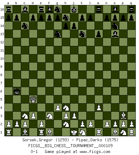 Last move : 0-1 2018 March 17 17:27:6 [Event "FICGS__BIG_CHESS__TOURNAMENT__000109"] [Site "FICGS"] [Date "2018.02.01"] [Round "1"] [White "Gorsek,Gregor"] [Black "Pipac,Darko"] [Result "0-1"] [WhiteElo "1293"] [BlackElo "1575"] 1.g2-g4 j15-k13 2.h1-d5 p16-o14 3.m2-m4 h15-g13 4.l1-o4 h16-o10 5.o4-c15 b16-c14 6.c15-p3 o10-f2 7.g1-f3 m15-m13 8.j2-h4 f2-b6 9.b1-c3 l16-o13 10.d2-d3 k16-h15 0-1 This big chess game has been lost on time (started : 2018.02.01 17:1:46) Follow this game move after move (download)In complicated positions, Bobby Fischer hardly had to be afraid of anybody. (Paul Keres) Fischer ist das größte Genie, das je vom Schachhimmel heruntergestiegen ist. (Mikhail Nekhemyevich Tal) El Ajedrez es una manera fabulosa para que los niños aprendan a autovalorarse y a autoestimarse. (Saudin Robovic) Aux échecs, les retours au sommet sont rares : les dommages psychologiques consécutifs à une défaite sont trop sévères. (Daily Telegraph) The leaves of memory seemed to make a mournful rustling in the dark. (Henry Wadsworth Longfellow)