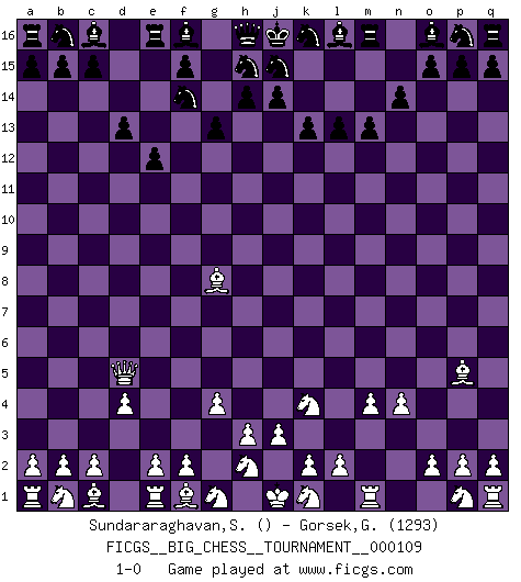 Last move : 1-0 2018 March 15 17:18:22 [Event "FICGS__BIG_CHESS__TOURNAMENT__000109"] [Site "FICGS"] [Date "2018.02.01"] [Round "1"] [White "Sundararaghavan,Shailesh"] [Black "Gorsek,Gregor"] [Result "1-0"] [WhiteElo ""] [BlackElo "1293"] 1.g2-g4 k15-k13 2.j2-k4 g16-f14 3.n2-n4 m15-m13 4.o1-d11 l15-l13 5.m2-m4 e15-e13 6.l1-p5 e13-e12 7.d11-c12 d15-d13 8.c12-g8 g15-g13 9.h1-d5 n15-n14 10.d2-d4 1-0 This big chess game has been lost on time (started : 2018.02.01 17:1:46) Follow this game move after move (download)Capture of the adverse King is the ultimate but not the first object of the game. (William Steinitz) Jede Eröffnung ist gut genug um gespielt zu werden, wenn nur ihr Ruf schlecht genug ist. (Savielly Grigorievitsch Tartakower) La vida es como un juego de Ajedrez, cambiando con cada movimiento. (Proverbio Chino) Un journaliste : 'Vous préférez avoir une dame de plus sur l'échiquier ou au lit ?' Boris Spassky : 'Ca dépend de la position.' In theory there is no difference between theory and practice. In practice there is. (Yogi Berra)