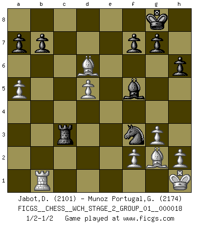 Last move : 1/2-1/2 2018 May 23 10:33:58 [Event "FICGS__CHESS__WCH_STAGE_2_GROUP_01__000018"] [Site "FICGS"] [Date "2018.02.01"] [Round "1"] [White "Jabot,Daniel"] [Black "Munoz Portugal,Guillermo"] [Result "1/2-1/2"] [WhiteElo "2101"] [BlackElo "2174"] 1.c4 e5 2.Nc3 Nf6 3.Nf3 Nc6 4.g3 Bb4 5.Bg2 O-O 6.O-O d6 7.d3 Re8 8.Nd5 Nxd5 9.cxd5 Ne7 10.e4 c6 11.d4 exd4 12.Qxd4 Bc5 13.Qc3 Qb6 14.Nd2 cxd5 15.exd5 Nf5 16.Ne4 Bd4 17.Qd3 Bd7 18.a4 Qa6 19.Qd1 Ra8c8 20.Re1 h6 21.a5 Qc4 22.Bf4 Bxb2 23.Rb1 Bc3 24.Rc1 Qd4 25.Nxc3 Rxc3 26.Qxd4 Rxe1 27.Rxe1 Nxd4 28.Bxd6 Bg4 29.Rb1 Nf3 30.Kh1 Bf5 1/2-1/2 English Opening Kingside Castling by player Black (move 5) Kingside Castling by player White (move 6) This chess game ended in a draw. Follow this game move after move (download)In life, as in Chess, one's own Pawns block one's way. A man's very wealth, ease, leisure, children, books, which should help him to win, more often checkmate him. (Charles Buxton) Das Schachspiel hat wie die Liebe, die Musik, die Fähigkeit, den Menschen glücklich zu machen. Ich habe ein leises Gefühl des Bedauerns für jeden, der das Schachspiel nicht kennt, so wie ich jeden bedaure, der die Liebe nicht kennt. (Siegbert Tarrasch) Si un gobernante no entiende al Ajedrez, ¿como puede governar él un reinado?. (El Rey Khusros II) Tous ces prétendus hommes politiques sont les pions, les Cavaliers, les Tours ou les Fous d'une partie d'échecs qui se jouera tant qu'un hasard ne renversera pas l'échiquier. (Honoré de Balzac) Men never do evil so completely and cheerfully as when they do it from religious conviction. (Blaise Pascal)