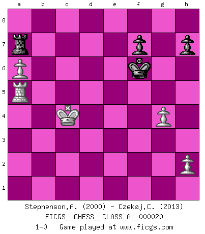 Last move : 1-0 2008 June 22 11:48:56 [Event "FICGS__CHESS__CLASS_A__000020"] [Site "FICGS"] [Date "2007.04.23"] [Round "1"] [White "Stephenson,Andrew"] [Black "Czekaj,Christophe"] [Result "1-0"] [WhiteElo "2000"] [BlackElo "2013"] 1.d4 Nf6 2.c4 g6 3.Nc3 d5 4.cxd5 Nxd5 5.e4 Nxc3 6.bxc3 Bg7 7.Bc4 c5 8.Ne2 O-O 9.O-O Nc6 10.Be3 Bg4 11.f3 Na5 12.Bb5 cxd4 13.cxd4 Bd7 14.Bd3 Rc8 15.Rc1 b5 16.Qd2 Nc4 17.Bxc4 bxc4 18.Bh6 Bxh6 19.Qxh6 Qb6 20.Rfd1 Rfd8 21.Nc3 Bc6 22.Rb1 Qa5 23.Qe3 Rb8 24.d5 Bd7 25.Qd4 Rb6 26.e5 Bf5 27.Rxb6 axb6 28.a4 Bd3 29.d6 exd6 30.exd6 Qc5 31.Qxc5 bxc5 32.Nb5 Bc2 33.Ra1 Bd3 34.Kf2 c3 35.Nxc3 Rxd6 36.a5 Ba6 37.Rd1 Rc6 38.Rb1 Rc8 39.Ne4 Bd3 40.Rb6 Bxe4 41.fxe4 c4 42.Ke2 c3 43.Kd1 Rc4 44.Kc2 Ra4 45.a6 Ra3 46.g4 g5 47.Rf6 Kg7 48.e5 Ra5 49.Kxc3 Rxe5 50.Rf5 Re7 51.Rxg5+ Kf6 52.Ra5 Ra7 53.Kc4 1-0 King's Indian defense, 3.Nc3 Kingside Castling by player Black (move 8) Kingside Castling by player White (move 9) 10 pieces endgame at move 49 : White KRPPP , Black KRPPP WHITE : King + 1 Rook 3 Pawns BLACK : King + 1 Rook 3 Pawns 9 pieces endgame at move 51 : White KRPPP , Black KRPP WHITE : King + 1 Rook 3 Pawns BLACK : King + 1 Rook 2 Pawns Player White won this chess game. Follow this game move after move (download)First-class players lose to second class players because second-class players sometimes play a first-class game. (Tarrasch) Es ist nicht das erste mal, dass sich die FIDE dem Arabischen Geld gebeugt hat (über die FIDE WM 2004 in Lybien). (Larry Evans) Te sientas frente a un tablero y repentinamente tu corazón brinca. Tu mano tiembla al tomar una pieza y moverla. Pero lo que el Ajedrez te enseña es que tu debes permanecer ahí con calma y pensar de que si realmente es una buena idea o de que si hay otras ideas mejores. (Stanley Kubrick) RxDa4 pat (...) Wikichess, chess moves explained by 'experimented' players. (Thibault de Vassal)