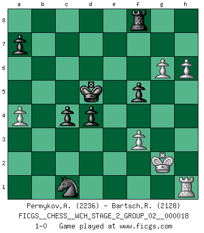Last move : 1-0 2018 March 22 13:59:27 [Event "FICGS__CHESS__WCH_STAGE_2_GROUP_02__000018"] [Site "FICGS"] [Date "2018.02.01"] [Round "1"] [White "Permykov,Andrey"] [Black "Bartsch,Reinhard Andrea"] [Result "1-0"] [WhiteElo "2236"] [BlackElo "2128"] 1.d4 Nf6 2.Nf3 d5 3.c4 e6 4.Nc3 c6 5.Bg5 dxc4 6.e4 b5 7.e5 h6 8.Bh4 g5 9.Nxg5 hxg5 10.Bxg5 Be7 11.exf6 Bxf6 12.Bxf6 Qxf6 13.g3 Bb7 14.Ne4 Qe7 15.Bg2 Na6 16.O-O O-O-O 17.h4 c5 18.a4 b4 19.Qe2 Rxd4 20.Rad1 Qc7 21.Ng5 Bxg2 22.Kxg2 Qc6+ 23.f3 Rf8 24.Rc1 Qd5 25.Rfd1 e5 26.Rxd4 exd4 27.Qxc4 Qxc4 28.Rxc4 Kd7 29.h5 b3 30.Ne4 Kc6 31.Rc1 Kd5 32.g4 f5 33.Nd2 Nb4 34.h6 Nd3 35.Rh1 Nxb2 36.g5 Nd3 37.Nxb3 c4 38.Nc1 Nxc1 39.g6 1-0 Queen's pawn game Kingside Castling by player White (move 16) Queenside Castling by player Black (move 16) Player White won this chess game. Follow this game move after move (download)The Pawns are the soul of the game. (Francois Andre Danican Philidor) Lisa Lane, amerikanische Schachmeisterin, hatte Fischer einmal als stärksten lebenden Spieler bezeichnet. Antwort: Das ist richtig, aber Lisa Lane ist eigentlich nicht in der Lage, das zu beurteilen. (Robert James Fischer) El Rey es una pieza de pelea. ¡Usenlo!. (Wilhelm Steinitz) Il (Jacob Murray) ne joue pas pour le bon coup, mais pour le meilleur. (Eloi Relange) A bird doesn't sing because it has an answer, it sings because it has a song. (Maya Angelou)