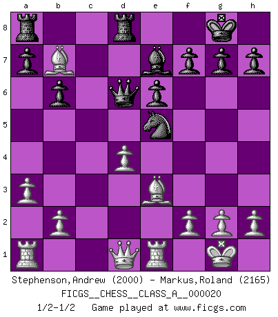 Last move : 1/2-1/2 2007 May 17 22:55:18 [Event "FICGS__CHESS__CLASS_A__000020"] [Site "FICGS"] [Date "2007.04.23"] [Round "1"] [White "Stephenson,Andrew"] [Black "Markus,Roland"] [Result "1/2-1/2"] [WhiteElo "2000"] [BlackElo "2165"] 1.e4 c6 2.c4 d5 3.exd5 cxd5 4.cxd5 Nf6 5.Nc3 Nxd5 6.Nf3 Nc6 7.Bb5 e6 8.O-O Be7 9.d4 O-O 10.Re1 Qd6 11.a3 Rd8 12.Bd3 Nf6 13.Be3 b6 14.Ne4 Nxe4 15.Bxe4 Bb7 16.Ne5 Nxe5 17.Bxb7 1/2-1/2 Caro-Kann : Anti-anti-Caro-Kann defense Kingside Castling by player White (move 8) Kingside Castling by player Black (move 9) This chess game ended in a draw. Follow this game move after move (download)Botvinnik tried to take the mystery out of Chess, always relating it to situations in ordinary life. He used to call Chess a typical inexact problem similar to those which people are always having to solve in everyday life. (Garry Kasparov) Im Fernschach kannst du während dem Spiel rauchen. (John Christen Knudsen) La pasion por jugar al Ajedrez es una de las mas inexplicables en el mundo. (H.G. Wells) La vie et les Echecs sont tous les deux une lutte constante. (Lasker) Men should grow up. - Yeah. And dogs should stop licking themselves. It's not gonna happen. (Gregory House to Dr. Cameron, House M.D.)