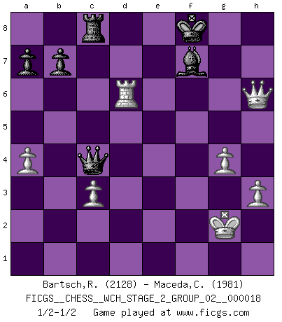 Last move : 1/2-1/2 2018 May 13 5:49:43 [Event "FICGS__CHESS__WCH_STAGE_2_GROUP_02__000018"] [Site "FICGS"] [Date "2018.02.01"] [Round "1"] [White "Bartsch,Reinhard Andrea"] [Black "Maceda,Coco"] [Result "1/2-1/2"] [WhiteElo "2128"] [BlackElo "1981"] 1.c4 e5 2.g3 Nf6 3.Bg2 d5 4.cxd5 Nxd5 5.Nc3 Nb6 6.e3 Nc6 7.Nge2 h5 8.d4 h4 9.d5 Ne7 10.e4 c6 11.h3 cxd5 12.exd5 hxg3 13.fxg3 Nf5 14.Qd3 Bc5 15.Ne4 Bb4+ 16.N2c3 Nxd5 17.O-O Bxc3 18.bxc3 O-O 19.Bg5 f6 20.Rad1 Be6 21.g4 Qb6+ 22.Kh2 Nfe3 23.Nxf6+ Rxf6 24.Rxf6 e4 25.Qxe4 gxf6 26.Bxe3 Nxe3 27.Qg6+ Kf8 28.Qxf6+ Bf7 29.Rd6 Qc7 30.Kh1 Nxg2 31.Kxg2 Rc8 32.Qh6+ Ke7 33.Qf6+ Kf8 34.a4 Qc4 35.Qh6+ 1/2-1/2 English Opening Kingside Castling by player White (move 17) Kingside Castling by player Black (move 18) This chess game ended in a draw. Follow this game move after move (download)In the perfect Chess combination as in a first-rate short story, the whole plot and counter-plot should lead up to a striking finale, the interest not being allayed until the very last moment. (Yates and Winter) Je mehr wir mit Computern analysieren, desto mehr glauben wir an Verteidigung. (Vladimir Kramnik) Un entendimiento a fondo de las continuaciones típicas del mate, hace de las combinaciones de sacrificio mas complicadas conducirlas a ellas no solo sin dificultad, sino casi de una manera natural. (Siegbert Tarrasch) Un journaliste : 'Vous préférez avoir une dame de plus sur l'échiquier ou au lit ?' Boris Spassky : 'Ca dépend de la position.' All the biggest technological inventions created by man - the airplane, the automobile, the computer - says little about his intelligence, but speaks volumes about his laziness. (Mark Kennedy)
