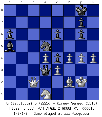 Last move : 1/2-1/2 2018 February 13 22:15:42 [Event "FICGS__CHESS__WCH_STAGE_2_GROUP_03__000018"] [Site "FICGS"] [Date "2018.02.01"] [Round "1"] [White "Ortiz,Clodomiro"] [Black "Kireev,Sergey"] [Result "1/2-1/2"] [WhiteElo "2225"] [BlackElo "2213"] 1.d4 d5 2.c4 c6 3.cxd5 cxd5 4.Bf4 Nc6 5.e3 Nf6 6.Nc3 a6 7.Bd3 Bg4 8.Nge2 e6 9.Rc1 Be7 10.O-O O-O 11.Bg3 Rc8 12.Bh4 Bh5 13.Qb3 Na5 14.Qc2 Bg6 15.Nf4 Bd6 16.Nxg6 hxg6 17.Qe2 Rc6 18.g4 Bb4 19.Nb1 Qb6 20.Bg3 Rfc8 21.Rxc6 Qxc6 22.f3 Ne8 23.Kh1 Qd7 24.Rd1 Qa4 25.a3 Bf8 26.Be1 Nc4 27.Rc1 Qd7 28.Nc3 b5 29.Kg1 Bd6 30.Kg2 Rc6 31.Rc2 Rc7 32.Kg1 Rc8 33.h4 Bc7 34.Nd1 Ned6 35.Bg3 Ne8 36.Be1 Ned6 37.Nc3 Nb7 38.Kg2 Nba5 39.f4 Bd6 40.Qf3 Nc6 41.Nd1 b4 42.axb4 Bxb4 43.Bf2 Ba5 44.b3 Nb4 45.bxc4 dxc4 46.Be4 f5 47.Qe2 fxe4 48.Rxc4 Nd5 49.Qc2 Rxc4 50.Qxc4 Qb5 51.Qc2 Qd3 1/2-1/2 QGD Slav defense : Exchange variation Kingside Castling by player White (move 10) Kingside Castling by player Black (move 10) This chess game ended in a draw. Follow this game move after move (download)The boy (then a 12 year old boy named Anatoly Karpov) doesn't have a clue about Chess, and there's no future at all for him in this profession. (Mikhail Botvinnik) Es gibt Leute, die glauben, alles wäre vernünftig, was man mit einem ernsthaften Gesicht tut. (Georg Christoph Lichtenberg) El Ajedrez es un regaderazo frío para la mente. (Sir John Simon) Même un GMI sait rarement calculer sur plus de cinq coups une attaque à sacrifices. (Rudolf Spielmann) A good book on your shelf is a friend that turns its back on you and remains a friend. (Author unknown)