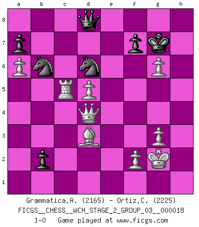 Last move : 1-0 2018 July 3 13:4:38 [Event "FICGS__CHESS__WCH_STAGE_2_GROUP_03__000018"] [Site "FICGS"] [Date "2018.02.01"] [Round "1"] [White "Grammatica,Andrea"] [Black "Ortiz,Clodomiro"] [Result "1-0"] [WhiteElo "2165"] [BlackElo "2225"] 1.d4 Nf6 2.c4 e6 3.g3 Bb4+ 4.Bd2 Be7 5.Bg2 d5 6.Nf3 O-O 7.O-O c6 8.Qc2 b6 9.Rd1 Nbd7 10.b3 Ba6 11.a4 Qc8 12.a5 dxc4 13.bxc4 c5 14.d5 exd5 15.cxd5 Bxe2 16.Re1 Bxf3 17.Bxf3 Bd6 18.Na3 Re8 19.Bg2 Qa6 20.Bf1 Qc8 21.Rxe8+ Nxe8 22.Bg2 Qa6 23.Bf1 Qc8 24.Bg2 Qa6 25.Qa4 Rd8 26.Nb5 h6 27.Bf1 Qb7 28.a6 Qb8 29.Re1 Ndf6 30.Bc3 Rd7 31.Bh3 Rd8 32.Bb2 h5 33.Qh4 Bf8 34.Be5 Bd6 35.Nxd6 Rxd6 36.Bf1 b5 37.Rb1 b4 38.Bxd6 Nxd6 39.Qf4 Ng4 40.Rc1 Qb6 41.Be2 Kh7 42.Kg2 Nf6 43.Qd2 Nd7 44.Qe3 h4 45.Qg5 h3+ 46.Kxh3 Nf6 47.Qe3 Nd7 48.Kg2 Qd8 49.Bb5 Nb6 50.Bd3+ g6 51.Rxc5 Kg8 52.h4 Kg7 53.h5 b3 54.hxg6 b2 55.Qd4+ 1-0 Catalan Opening Kingside Castling by player Black (move 6) Kingside Castling by player White (move 7) Player White won this chess game. Follow this game move after move (download)Checkers is for tramps. (Paul Morphy) Mutter, ich bin eben Ex-Weltmeister geworden. --beim nach Hause Kommen nach dem Verlust des WM-Titels an Mihail Botvinnik -- (Mikhail Nekhemyevich Tal) Es el objetivo de la escuela moderna no tratar cada posición de acuerdo a una regla general, sino de acuerdo al principio inherente en la posición. (Richard Reti) Il (Jacob Murray) ne joue pas pour le bon coup, mais pour le meilleur. (Eloi Relange) Locking firmely the window serves nothing, only small thiefs pass through there, the big thiefs enter through the front door. (Luc-Olivier Leclerc)