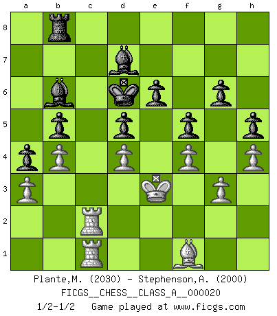 Last move : 1/2-1/2 2008 January 18 2:53:24 [Event "FICGS__CHESS__CLASS_A__000020"] [Site "FICGS"] [Date "2007.04.23"] [Round "1"] [White "Plante,Marc-Eric"] [Black "Stephenson,Andrew"] [Result "1/2-1/2"] [WhiteElo "2030"] [BlackElo "2000"] 1.e4 c5 2.Nf3 e6 3.d4 cxd4 4.Nxd4 Nf6 5.Nc3 Bb4 6.e5 Nd5 7.Qg4 O-O 8.Bh6 g6 9.Bxf8 Qxf8 10.Qg3 Qc5 11.Nde2 Nc6 12.O-O-O Nxc3 13.Nxc3 Qxe5 14.Qxe5 Nxe5 15.Be2 d5 16.f4 Nc6 17.a3 Bc5 18.g3 Nd4 19.Bg4 b5 20.Rd3 h5 21.Bh3 Rb8 22.b4 Bb6 23.Rhd1 Nc6 24.Bf1 a6 25.Kb2 Kg7 26.Ne2 Bd7 27.h4 a5 28.c3 a4 29.Nd4 Nxd4 30.cxd4 f5 31.Kc2 Bd8 32.Rc3 Kf7 33.Kd3 Ke7 34.Rdc1 Kd6 35.Ke3 Ke7 36.Rc5 Kd6 37.Be2 Bb6 38.R5c2 Bd8 39.Bf1 Bb6 1/2-1/2 Sicilian : Pin, Koch variation Kingside Castling by player Black (move 7) Queenside Castling by player White (move 12) This chess game ended in a draw. Follow this game move after move (download)Pawns: they are the soul of this game, they alone form the attack and defense. (Philidor) Wenn Schach ein enormer Dschungel ist, der seine Myriaden von Geheimnissen nicht preisgeben will, dann sind Computer die Kettensägen einer gewaltigen ökologisch unsensiblen Nutzholzfirma. (Nigel Short) ¿Que sería del Ajedrez sin errores graciosos?. (Kurt Richter) Seul un grand joueur sait à quel point il joue faiblement. (Xavier Tartacover) Never was anything great achieved without danger. (Niccolo Machiavelli)