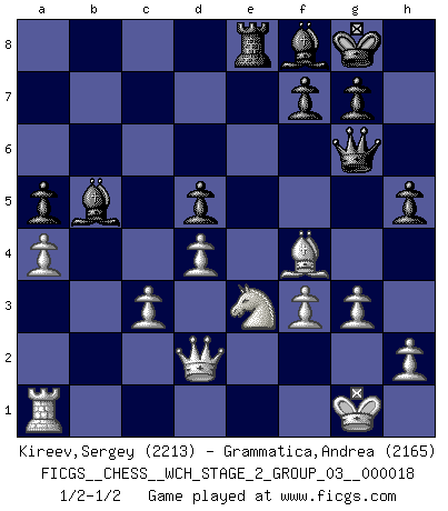 Last move : 1/2-1/2 2018 March 11 21:30:48 [Event "FICGS__CHESS__WCH_STAGE_2_GROUP_03__000018"] [Site "FICGS"] [Date "2018.02.01"] [Round "1"] [White "Kireev,Sergey"] [Black "Grammatica,Andrea"] [Result "1/2-1/2"] [WhiteElo "2213"] [BlackElo "2165"] 1.e4 e5 2.Nf3 Nc6 3.Bb5 a6 4.Ba4 Nf6 5.O-O Be7 6.Re1 b5 7.Bb3 O-O 8.c3 d5 9.exd5 Nxd5 10.Nxe5 Nxe5 11.Rxe5 c6 12.d4 Bd6 13.Re1 Qh4 14.g3 Qh3 15.Qe2 Bg4 16.Qf1 Qh5 17.Nd2 Rae8 18.Rxe8 Rxe8 19.f3 Bh3 20.Qf2 Bf5 21.Nf1 Qg6 22.Bxd5 cxd5 23.Ne3 Bd7 24.Bd2 h5 25.Ng2 a5 26.Bf4 Bf8 27.Ne3 b4 28.Qd2 bxc3 29.bxc3 Bb5 30.a4 1/2-1/2 Ruy Lopez : Closed, 7...O-O Kingside Castling by player White (move 5) Kingside Castling by player Black (move 7) This chess game ended in a draw. Follow this game move after move (download)I give 98 percent of my mental energy to Chess. Others give only 2 percent. (Bobby Fischer) Dein Körper muss in Topform sein. Dein Schach verfällt, wenn dein Körper verfällt. Der Körper kann nicht vom Geist getrennt werden. (Robert James Fischer) Botvinnik trató de alejar el misterio referente al Ajedrez, siempre relacionandolo a situaciones de la vida diaria. Solía llamar al Ajedrez un problema inexacto típico, similar a aquellos en que la gente tiene siempre que resolver a cada día. (Garry Kasparov) Je ne suis pas le dernier à jouer lâchement des coups douteux pendant le zeïtnot de l'adversaire pour l'achever: en effet les coups qui font le plus peur sont ceux que l'on ne comprend pas. Je me fais souvent peur quand je joue. (Un professeur anonyme) Cactus - It is depressed cucumber. (Ilmars Cirulis)