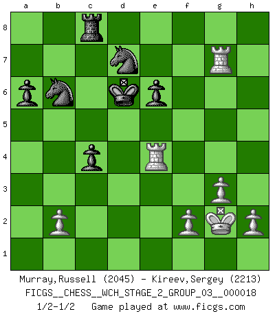 Last move : 1/2-1/2 2018 March 7 9:17:47 [Event "FICGS__CHESS__WCH_STAGE_2_GROUP_03__000018"] [Site "FICGS"] [Date "2018.02.01"] [Round "1"] [White "Murray,Russell"] [Black "Kireev,Sergey"] [Result "1/2-1/2"] [WhiteElo "2045"] [BlackElo "2213"] 1.d4 d5 2.Nf3 Nf6 3.c4 c6 4.Nc3 e6 5.g3 dxc4 6.Bg2 Nbd7 7.O-O b5 8.e4 Bb7 9.e5 Nd5 10.Ng5 h6 11.Nxe6 fxe6 12.Qh5+ Ke7 13.Ne4 Qe8 14.Bg5+ hxg5 15.Qxh8 Kd8 16.Nxg5 Kc8 17.a4 c5 18.Rfd1 bxa4 19.Rxa4 N5b6 20.Ra5 Bxg2 21.Kxg2 cxd4 22.Rxd4 Kb7 23.Ne4 Qg6 24.Qh4 Rc8 25.Nd6+ Bxd6 26.exd6 a6 27.Rg5 Qc2 28.Qe4+ Qxe4+ 29.Rxe4 Kc6 30.Rxg7 Kxd6 1/2-1/2 Queen's pawn game Kingside Castling by player White (move 7) This chess game ended in a draw. Follow this game move after move (download)My style is somewhere between that of Tal and Petrosian. (Reshevsky) Die Partien sind immer verschieden, die Interviews immer die gleichen. (Garry Kasparov) El Ajedrez es un cuento de Hadas de las 1001 metidas de pata. (Savielly Tartakower) Mon pion favori sur ma case favorite ! Bronstein en parlant d'un coup de pion en h5 quand il avait les Noirs. You can think I'm wrong, but that's no reason to quit thinking. (Gregory House, House M.D.)