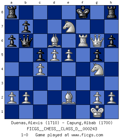Last move : 1-0 2018 February 19 15:44:55 [Event "FICGS__CHESS__CLASS_D__000243"] [Site "FICGS"] [Date "2018.02.01"] [Round "1"] [White "Duenas,Alexis"] [Black "Capung,Albab"] [Result "1-0"] [WhiteElo "1710"] [BlackElo "1700"] 1.d4 e6 2.c4 c5 3.d5 e5 4.Nc3 d6 5.e4 h6 6.f4 exf4 7.Bxf4 Qa5 8.Nf3 g5 9.Bg3 Bg4 10.Be2 Bg7 11.O-O Qb6 12.Nb5 a6 13.Nxd6+ Kf8 14.Ne5 Nf6 15.Nxg4 Nh5 16.Rxf7+ Kg8 17.Rxg7+ Kxg7 18.Nf5+ Kh7 19.Bd6 Nd7 20.Qc2 Ng7 21.e5 Kg8 22.Ne7+ Kf7 23.Qg6+ Kf8 24.Rf1+ Nf5 25.Rxf5+ Nf6 26.Rxf6+ 1-0 Queen's pawn Kingside Castling by player White (move 11) Player White won this chess game. Follow this game move after move (download)Later, I began to succeed in decisive games. Perhaps because I realized a very simple truth: not only was I worried, but also my opponent. (Mikhail Tal) Im Spitzenschach von heute geht es nur um Vorbereitung, um tiefgründige, sorgfältige Eröffnungsvorbereitung. (Nigel Short) El Ajedrez es un invernadero donde los frutos del carácter pueden madurar mas completamente que en la vida. (Edward Morgan Foster) Si rien de grave n'est détecté lors de l'analyse d'une position, on joue alors le coup. Seconde règle de Blumenfeld. Even the best needles are not sharp at both ends. (Chinese proverb)