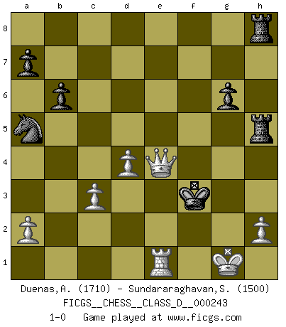 Last move : 1-0 2018 February 21 9:46:43 [Event "FICGS__CHESS__CLASS_D__000243"] [Site "FICGS"] [Date "2018.02.01"] [Round "1"] [White "Duenas,Alexis"] [Black "Sundararaghavan,Shailesh"] [Result "1-0"] [WhiteElo "1710"] [BlackElo "1500"] 1.d4 d5 2.c4 dxc4 3.e3 Nf6 4.Bxc4 e6 5.Nf3 Nc6 6.O-O Bd6 7.Nc3 O-O 8.e4 Bb4 9.Qd3 Bxc3 10.bxc3 Na5 11.e5 Nd5 12.Ng5 g6 13.Qh3 h5 14.Be2 Kg7 15.Qg3 Bd7 16.Bxh5 Rh8 17.Nxf7 Rxh5 18.Nxd8 Rxd8 19.Bg5 Rdh8 20.Bf6+ Nxf6 21.exf6+ Kxf6 22.Qxc7 Bc6 23.Qf4+ Ke7 24.Rfe1 b6 25.Qc7+ Kf6 26.Rxe6+ Kxe6 27.Re1+ Kf6 28.Qe7+ Kf5 29.Qe5+ Kg4 30.f3+ Bxf3 31.gxf3+ Kxf3 32.Qe4+ 1-0 Queen's gambit accepted Kingside Castling by player White (move 6) Kingside Castling by player Black (move 7) Player White won this chess game. Follow this game move after move (download)Suddenly it was obvious to me in my analysis I had missed what Fischer had found with the greatest of ease at the board. (Mikhail Botvinnik) Die größte Kunst beim Schach besteht darin dem Gegner nicht zu zeigen was er tun kann. (Garry Kasparov) Una victoria por una combinación errónea, aunque sea espectacular, me llena de horror artístico. (Wilhelm Steinitz) La tactique est l'élément le plus important du milieu de jeu. (Siegbert Tarrasch) The intuitive mind is a sacred gift; the rational mind is a faithful servant. We have created a society that honors the servant but has forgotten the gift. (Albert Einstein)