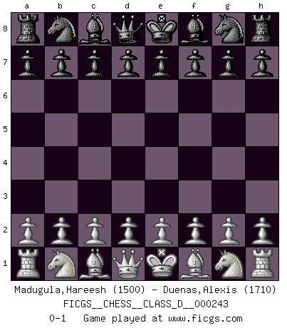 Last move : 0-1 2018 March 14 5:8:8 [Event "FICGS__CHESS__CLASS_D__000243"] [Site "FICGS"] [Date "2018.02.01"] [Round "1"] [White "Madugula,Hareesh"] [Black "Duenas,Alexis"] [Result "0-1"] [WhiteElo "1500"] [BlackElo "1710"] 0-1 This chess game has been lost on time (started : 2018.02.01 23:32:30) Player Black won this chess game. Follow this game move after move (download)The passion for playing Chess is one of the most unaccountable in the world. (H.G. Wells) Dieses schreckliche Gefühl, dass ich gegen eine Maschine spielte, die niemals Fehler macht, zerschmetterte meinen Widerstand. (Mark Taimanov) Solo los afeminados hacen el Enroque. (Rob Sillars) Ne tendez aucun piège pour le plaisir ! Ne jouez rien dans l'espoir que l'adversaire réagisse de façon stupide ! Prenez toujours pour acquis que l'adversaire va trouver le meilleur coup ! Ne jouez jamais de coup dans l'espoir que l'adversaire ne voie pas la menace ! Chacun de vos coups doit améliorer la position d'une façon ou d'une autre. Some people are so afraid to die that they never begin to live. (Henry Van Dyke)
