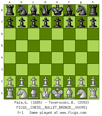 Last move : 0-1 2018 February 2 12:32:28 [Event "FICGS__CHESS__BULLET_BRONZE__000951"] [Site "FICGS"] [Date "2018.02.02"] [Round "1"] [White "Pala,Giorgio"] [Black "Teverovski,Bogoljub"] [Result "0-1"] [WhiteElo "1685"] [BlackElo "2053"] 0-1 This chess game has been lost on time (started : 2018.02.02 11:17:11) Player Black won this chess game. Follow this game move after move (download)The older I grow, the more I value pawns. (Paul Keres) Auf jeden Fall musst du zuerst Rechtsanwalt werden, damit du deine eigenen Interessen und die deiner Familie vertreten kannst. [Brief an seinen Sohn] (José Raúl Capablanca) Fischer es una tragedia del Ajedrez Americano a la par con Morphy y Pillsbury. (Mig Greengard) Si rien de grave n'est détecté lors de l'analyse d'une position, on joue alors le coup. Seconde règle de Blumenfeld. There are two kinds of people in the world, my friend. Those who have a loaded gun and those who dig. You dig ! (Blondie in The Good, The Bad and The Ugly)
