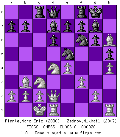 Last move : 1-0 2007 July 14 23:0:55 [Event "FICGS__CHESS__CLASS_A__000020"] [Site "FICGS"] [Date "2007.04.23"] [Round "1"] [White "Plante,Marc-Eric"] [Black "Zedrov,Mikhail"] [Result "1-0"] [WhiteElo "2030"] [BlackElo "2007"] 1.e4 c5 2.Nf3 d6 3.d4 cxd4 4.Nxd4 Nf6 5.Nc3 g6 6.Be3 Bg7 7.f3 Nc6 8.Qd2 O-O 9.Bc4 Bd7 10.O-O-O Rc8 11.Bb3 Ne5 12.h4 h5 13.Bh6 1-0 This chess game has been lost on time (started : 2007.04.23 11:59:7) Sicilian : Dragon, Yugoslav attack Kingside Castling by player Black (move 8) Queenside Castling by player White (move 10) Player White won this chess game. Follow this game move after move (download)Combinations have always been the most intriguing aspect of Chess. The masters look for them, the public applauds them, the critics praise them. It is because combinations are possible that Chess is more than a lifeless mathematical exercise. They are the poetry of the game; they are to Chess what melody is to music. They represent the triumph of mind over matter. (Reuben Fine) Fischer machte Schach einfach zu einer aufregenden Sache, wann immer er sich ans Brett setzte. (Raymond Keene) Uno no tiene que jugar muy bien, es suficiente jugar mejor que el oponente. (Siegbert Tarrasch) Les Echecs ne sont pas pour les âmes timides. Ils requièrent un homme entier, qui ne s'arrête pas aveuglément à ce qui a été déjà établi, mais qui tente individuellement de sonder les profondeurs du jeu. (W. Steinitz) Thibault, I ask for draw. Game 13876. - Sorry Ilmars, you won. (FICGS chat)
