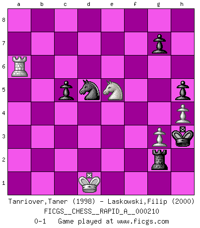 Last move : 0-1 2018 August 10 0:54:54 [Event "FICGS__CHESS__RAPID_A__000210"] [Site "FICGS"] [Date "2018.02.03"] [Round "1"] [White "Tanriover,Taner"] [Black "Laskowski,Filip"] [Result "0-1"] [WhiteElo "1998"] [BlackElo "2000"] 1.e4 e5 2.Nf3 Nc6 3.Bc4 Bc5 4.b4 Bxb4 5.c3 Ba5 6.d4 exd4 7.O-O Nge7 8.cxd4 d5 9.exd5 Nxd5 10.Qb3 Be6 11.Ba3 Rb8 12.Rd1 Bb4 13.Bxb4 Ncxb4 14.a3 b5 15.axb4 bxc4 16.Qxc4 O-O 17.Qc5 Nf4 18.Qe5 Bb3 19.Rf1 Ng6 20.Qc5 Bd5 21.Nbd2 Rb6 22.Rfe1 Nf4 23.Qe7 Rg6 24.Nh4 Rg4 25.g3 Nh3+ 26.Kf1 Rxd4 27.Nhf3 Qxe7 28.Rxe7 Rxb4 29.Rxa7 Rb2 30.Re2 h6 31.Ra1 Rd8 32.Rc1 Ra8 33.Nc4 Rba2 34.Nfd2 R8a4 35.f4 Bb7 36.Ke1 Ba6 37.Re8+ Kh7 38.Re3 Nf2 39.Rec3 Ng4 40.h3 Nf6 41.R3c2 Nd5 42.Rxa2 Rxa2 43.Rb1 Rc2 44.Na3 Rc6 45.Kf2 h5 46.Nf3 Rc3 47.Rd1 Bb7 48.Ng5+ Kg6 49.Nb1 Rc2+ 50.Rd2 Rc1 51.Rb2 Bc8 52.h4 Nf6 53.Ke2 Ba6+ 54.Kd2 Rg1 55.Rb3 Nd5 56.f5+ Kxf5 57.Nxf7 c5 58.Rf3+ Kg4 59.Ne5+ Kh3 60.Ra3 Rxb1 61.Rxa6 Rb2+ 62.Kd1 Rg2 0-1 Comment by player 2 : Filip Laskowski : Also thanks for the game. Evans gambit Kingside Castling by player White (move 7) Kingside Castling by player Black (move 16) Player Black won this chess game. Follow this game move after move (download)Some sacrifices are sound; the rest are mine. (Mikhail Tal) Strategie ist, wie man ein Mädchen auf den Rücksitz bekommt. Taktik ist, was man tut, wenn man dann dort ist. (Anonymous) Una de estas pequeñas movidas modestas pudieran ser mas molestas a tu oponente que la amenaza mas grande. (Siegbert Tarrasch) Il a essayé de se convaincre qu'il pourrait empêcher toutes les erreurs et ne jamais perdre. L'horreur ! Gary Kasparov au sujet de Robert Fischer. The problem with manipulation is that people can turn on you. (Horatio Caine, C.S.I. Miami)