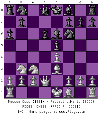 Last move : 1-0 2018 March 18 17:46:41 [Event "FICGS__CHESS__RAPID_A__000210"] [Site "FICGS"] [Date "2018.02.03"] [Round "1"] [White "Maceda,Coco"] [Black "Palladino,Mario"] [Result "1-0"] [WhiteElo "1981"] [BlackElo "2000"] 1.e4 c5 2.Nf3 d6 3.d4 cxd4 4.Nxd4 Nf6 5.Nc3 a6 6.Be3 e5 7.Nb3 Be6 8.Qd2 1-0 This chess game has been lost on time (started : 2018.02.03 22:44:56) Sicilian : Najdorf, Byrne (English) attack Player White won this chess game. Follow this game move after move (download)Via the squares on the chessboard, the Indians explain the movement of time and the age, the higher influences which control the world and the ties which link Chess with the human soul. (Al-Masudi) Ein Großmeister muß tausende Partien in seinem Kopf speichern, denn diese sind für Ihn, was die Worte der Muttersprache für gewöhnliche Leute sind, oder Noten für Musiker... (Garry Kasparov) La vida es como el Ajedrez, con lucha, competición y eventos buenos y malos. (Benjamin Franklin) Le profane ne songe pas à la somme de jouissance dont il se prive, qui méconnaît ce jeu aux ressources aussi variées que passionnantes. (Jean-Marie Jeanton-Lamarche) Never risk one's whole fortune unless supported by one's entire army. (Niccolo Machiavelli)