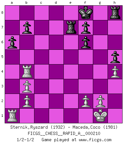 Last move : 1/2-1/2 2018 April 9 22:11:26 [Event "FICGS__CHESS__RAPID_A__000210"] [Site "FICGS"] [Date "2018.02.03"] [Round "1"] [White "Sternik,Ryszard"] [Black "Maceda,Coco"] [Result "1/2-1/2"] [WhiteElo "1932"] [BlackElo "1981"] 1.e4 c5 2.c3 d5 3.exd5 Qxd5 4.d4 Nf6 5.Nf3 Nc6 6.Be3 e6 7.Na3 cxd4 8.Nb5 Qd8 9.Nbxd4 Nd5 10.Bg5 Qb6 11.Bc4 Nxd4 12.Nxd4 Bc5 13.Bxd5 Bxd4 14.O-O Bxc3 15.Bb3 Bd4 16.Ba4+ Kf8 17.Be3 e5 18.Bb3 h5 19.Qf3 Qf6 20.Qxf6 gxf6 21.Bxd4 exd4 22.Rfd1 Be6 23.Rxd4 Re8 24.h4 Bxb3 25.axb3 a6 26.Rb4 Re7 1/2-1/2 Sicilian : Alapin's variation (2.c3) Kingside Castling by player White (move 14) This chess game ended in a draw. Follow this game move after move (download)Fischer is the strongest player in the world. In fact, the strongest player who ever lived. (Larry Evans) Alles was am Schachbrett zählt sind gute Züge. (Robert James Fischer) Bobby solo arroja las piezas y solas caen en las casillas correctas. (Miguel Najdorf ) Vouloir jouer aux échecs contre soi-même est aussi paradoxal que vouloir marcher sur son ombre. (Stefan Zweig) It's not the size of the dog in the fight, it's the size of the fight in the dog. (Mark Twain)