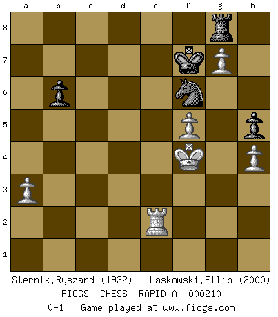Last move : 0-1 2018 May 19 11:26:32 [Event "FICGS__CHESS__RAPID_A__000210"] [Site "FICGS"] [Date "2018.02.03"] [Round "1"] [White "Sternik,Ryszard"] [Black "Laskowski,Filip"] [Result "0-1"] [WhiteElo "1932"] [BlackElo "2000"] 1.e4 e6 2.d4 d5 3.e5 c5 4.c3 Qb6 5.Nf3 Nc6 6.a3 Nh6 7.b4 cxd4 8.Bxh6 gxh6 9.cxd4 Bd7 10.Ra2 Rg8 11.h3 Be7 12.g3 f6 13.b5 Nd8 14.Bd3 fxe5 15.Nxe5 Bf6 16.Bxh7 Rg7 17.Qh5+ Ke7 18.Nxd7 Kxd7 19.Bg6 Bxd4 20.O-O a6 21.Kg2 axb5 22.Re2 e5 23.Bf5+ Kc7 24.Rc1+ Kb8 25.Nc3 Rg5 26.Qf3 Qc6 27.h4 Rxf5 28.Qxf5 Bxc3 29.Rxe5 d4 30.Kh2 Ra6 31.Rxb5 Qf6 32.Qxf6 Rxf6 33.Kg2 b6 34.f4 Nb7 35.Kf3 Kc7 36.g4 Nc5 37.g5 Rf8 38.g6 h5 39.Rb4 Bd2 40.g7 Rg8 41.Rg1 d3 42.Rc4 Ba5 43.f5 Kd6 44.Rg6+ Kd5 45.Rc1 Nd7 46.Ke3 d2 47.Rd1 Ne5 48.Rg5 Ng4+ 49.Ke2 Re8+ 50.Kf3 Nf6 51.Rg2 Rg8 52.Kf4 Kd6 53.R1xd2+ Bxd2+ 54.Rxd2+ Ke7 55.Re2+ Kf7 0-1 Comment by player 2 : Filip Laskowski : Również dzięki za ciekawą rozgrywkę. French : Advance variation Kingside Castling by player White (move 20) Player Black won this chess game. Follow this game move after move (download)All I want to do, ever, is just play Chess. (Bobby Fischer) Kritik überlasse ich den Spießern. Ich zeige nichts, wofür ich mich schämen muss. (Alexandra Kosteniuk) Alguna parte de un error es siempre correcto. (Savielly Tartakover) Je crois qu'il existe des manières très spécifiques de jouer efficacement contre une machine. Evidemment, nous n'avons aucune chance en technique pure, parce que l'ordinateur calcule de manière parfaite. Mais lorsque nous faisons appel à notre cerveau, en utilisant l'intuition et la compréhension, alors nous restons beaucoup plus forts. (Anatoli Karpov) God is an atheist. (Unknown)