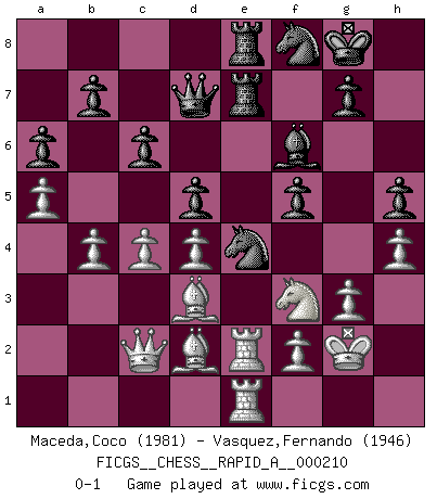 Last move : 0-1 2018 June 18 15:12:14 [Event "FICGS__CHESS__RAPID_A__000210"] [Site "FICGS"] [Date "2018.02.03"] [Round "1"] [White "Maceda,Coco"] [Black "Vasquez,Fernando"] [Result "0-1"] [WhiteElo "1981"] [BlackElo "1946"] 1.e4 e5 2.Nf3 Nf6 3.Nxe5 d6 4.Nf3 Nxe4 5.d4 d5 6.Bd3 Nc6 7.O-O Be7 8.Re1 Bg4 9.c3 f5 10.Nbd2 Qd6 11.Qa4 O-O 12.Qb3 Kh8 13.h3 Bxf3 14.Nxf3 a6 15.Be3 Bf6 16.Rad1 h6 17.Bc1 Rae8 18.Be3 Na5 19.Qc2 Nc6 20.Qb3 Na5 21.Qc2 Nc6 22.a4 Re6 23.b4 Rfe8 24.Bc1 Qd7 25.Re2 Qd6 26.g3 Qe7 27.Kg2 Qd7 28.h4 Qf7 29.Rh1 Kg8 30.R2e1 Ne7 31.Be3 Rc6 32.Bd2 Re6 33.Qc1 h5 34.Re2 c6 35.a5 Ng6 36.Rhe1 Qd7 37.c4 R6e7 38.Qc2 Nf8 0-1 This chess game has been lost on time (started : 2018.02.03 22:44:56) Petrov : Classical attack Kingside Castling by player White (move 7) Kingside Castling by player Black (move 11) Player Black won this chess game. Follow this game move after move (download)The older I grow, the more I value pawns. (Paul Keres) Auf jeden Fall musst du zuerst Rechtsanwalt werden, damit du deine eigenen Interessen und die deiner Familie vertreten kannst. [Brief an seinen Sohn] (José Raúl Capablanca) Fischer sacrificó virtualmente todo lo que la mayoría de nosotros los 'debiles' (término que él usa) valoramos, respetamos y apreciamos por el amor de un astuto, a menudo hermoso tablero de juego, por el privilegio ambivalente de ser su mas grande maestro. (Paul Kollar) Shah mat. Le roi est mort. Cri de fierté d'un joueur venant de terrasser son adversaire, courtoisement, sans effusion de sang. Logic : The art of thinking and reasoning in strict accordance with the limitations and incapacities of the human misunderstanding. (Ambrose Bierce)