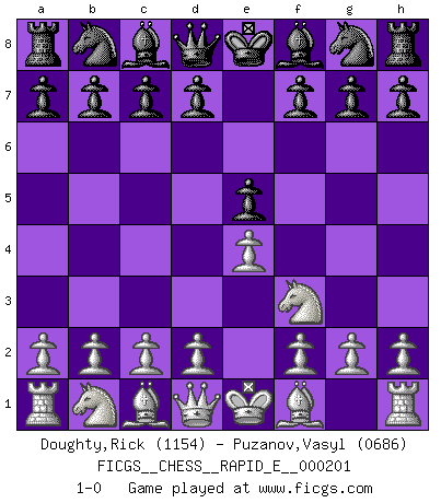 Last move : 1-0 2018 May 11 11:7:2 [Event "FICGS__CHESS__RAPID_E__000201"] [Site "FICGS"] [Date "2018.03.21"] [Round "1"] [White "Doughty,Rick"] [Black "Puzanov,Vasyl"] [Result "1-0"] [WhiteElo "1154"] [BlackElo "0686"] 1.e4 e5 2.Nf3 1-0 This chess game has been lost on time (started : 2018.03.21 16:1:10) King's knight Opening Player White won this chess game. Follow this game move after move (download)Chess is played with the mind and not with the hands ! (Renaud and Kahn) Du kannst im Schach nur gut werden, wenn du das Spiel liebst. (Robert James Fischer) Me gusta decir que Bobby Fischer fue el mejor jugador que jamás haya existido. Pero lo que hizo de Fischer un genio, fue su habilidad de mezclar una frescura y pragmatismo Americano con ideas Rusas acerca de la estrategia. (Bruce Pandolfini) Des points faibles ou des trous dans la position de l'adversaire doivent être occupés par des pièces et non pas par des pions. (Siegbert Tarrasch) Chess is everything: art, science and sport. (Anatoly Karpov)