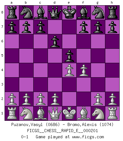 Last move : 0-1 2018 March 12 5:4:19 [Event "FICGS__CHESS__RAPID_E__000201"] [Site "FICGS"] [Date "2018.02.07"] [Round "1"] [White "Puzanov,Vasyl"] [Black "Bromo,Alexis"] [Result "0-1"] [WhiteElo "0686"] [BlackElo "1074"] 1.e4 e5 2.f4 d6 0-1 This chess game has been lost on time (started : 2018.02.07 21:20:24) King's gambit Player Black won this chess game. Follow this game move after move (download)To avoid losing a piece, many a person has lost the game. (Savielly Tartakover) Wer wird heute Abend ihr Gegner sein? -- Heute Abend spiele ich gegen die schwarzen Steine. (Akiba Rubinstein) a manera como él juega al Ajedrez, demuestra la completa naturaleza de un hombre. (Stanley Ellin) Mais l'homme est une créature légère et illogique : semblable au joueur d'échecs, il n'aime que le processus du but à atteindre, non le but lui-même. (Dostoïevsky) There is no vagueness without wind. (Chinese proverb)