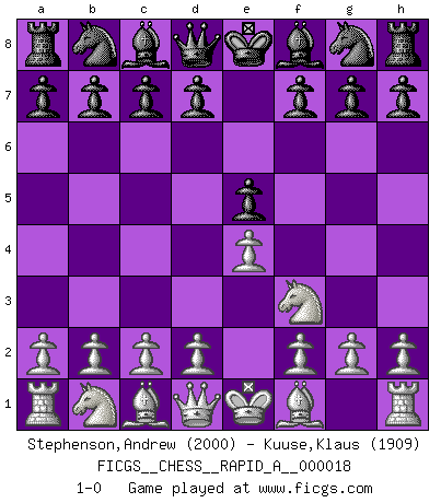 Last move : 1-0 2007 May 27 11:13:45 [Event "FICGS__CHESS__RAPID_A__000018"] [Site "FICGS"] [Date "2007.04.23"] [Round "1"] [White "Stephenson,Andrew"] [Black "Kuuse,Klaus"] [Result "1-0"] [WhiteElo "2000"] [BlackElo "1909"] 1.e4 e5 2.Nf3 1-0 This chess game has been lost on time (started : 2007.04.23 15:25:26) King's knight Opening Player White won this chess game. Follow this game move after move (download)Not all artists are Chess players, but all Chess players are artists. (Marcel Duchamp) Ich rechne überhaupt nicht voraus. Ich gewinne auch so. (Robert James Fischer) Muchos jugadores de Ajedrez se sorprendían cuando después de la partida, Fischer explicaba con calma: 'Yo ya había analizado esta posibilidad' en una posición en la cual yo creía que no era posible de prever desde la apertura. (Mikhail Tal) Aidez vos pièces, elles vous aideront. (Paul Morphy) A good programmer is someone who always looks both ways before crossing a one-way street. (Doug Linder)