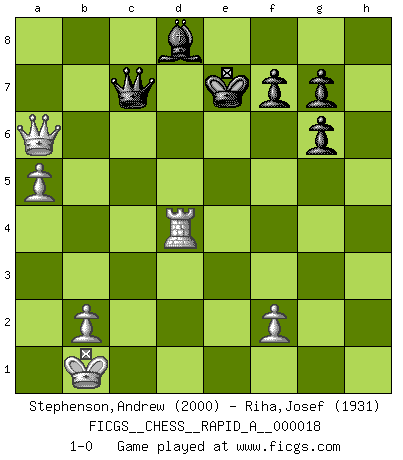 Last move : 1-0 2007 May 17 12:47:2 [Event "FICGS__CHESS__RAPID_A__000018"] [Site "FICGS"] [Date "2007.04.23"] [Round "1"] [White "Stephenson,Andrew"] [Black "Riha,Josef"] [Result "1-0"] [WhiteElo "2000"] [BlackElo "1931"] 1.d4 d5 2.c4 c6 3.Nf3 Nf6 4.e3 Bg4 5.h3 Bh5 6.Nc3 e6 7.g4 Bg6 8.Ne5 Nbd7 9.Nxg6 hxg6 10.Bd2 dxc4 11.Bxc4 Nb6 12.Be2 Be7 13.Qc2 Nfd5 14.O-O-O Nxc3 15.Bxc3 Qd5 16.Kb1 Qg2 17.e4 Rxh3 18.Rxh3 Qxh3 19.a4 Qg2 20.a5 Nd7 21.d5 cxd5 22.exd5 exd5 23.Bb5 Rd8 24.Be5 a6 25.Ba4 Kf8 26.Bc7 Nf6 27.Bxd8 Bxd8 28.Rd4 Qh2 29.g5 Qg1+ 30.Ka2 Qxg5 31.Qc8 Ne8 32.Bxe8 Kxe8 33.Qxb7 Qc1 34.Qa8 Ke7 35.Qxd5 Qc7 36.Kb1 Ke8 37.Qa8 Ke7 38.Qxa6 1-0 QGD Slav : 4.e3 Queenside Castling by player White (move 14) Player White won this chess game. Follow this game move after move (download)All Chess players should have a hobby. (Savielly Tartakower) Im Schach nämlich geht es darum, daß Ich des Gegners klein zu kriegen, sein Ego zu zerbrechen und zu zermahlen, seine Selbstachtung zu zertreten und zu verscharren und seine ganze mißachtenswerte sogenannte Persönlichkeit ein für alle Mal tot zu hacken und zu zerstampfen und dadurch die menschliche Gesellschaft von einer stinkenden Pestbeule zu befreien. Es ist ein königliches Spiel. (Robert James Fischer) El Ajedrez no es como la vida... ¡tiene reglas!. (Mark Pasternak) Les erreurs sont comme les malheurs, elles n'arrivent jamais seules. (Siegbert Tarrasch) Without deviation from the norm, progress is not possible. (Frank Zappa)