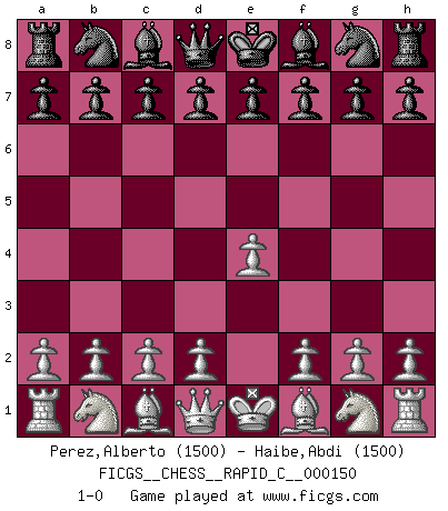 Last move : 1-0 2018 April 20 9:19:44 [Event "FICGS__CHESS__RAPID_C__000150"] [Site "FICGS"] [Date "2018.03.20"] [Round "1"] [White "Perez,Alberto"] [Black "Haibe,Abdi"] [Result "1-0"] [WhiteElo "1500"] [BlackElo "1500"] 1.e4 1-0 This chess game has been lost on time (started : 2018.03.20 20:7:28) King's pawn Opening Player White won this chess game. Follow this game move after move (download)One bad move nullifies forty good ones. (Horowitz) Ein Buch ist ein Spiegel; wenn ein Affe hineinsieht, so kann kein Apostel heraus gucken. (Georg Christoph Lichtenberg) Cada Peón es una Reina en potencia. (James Mason) Karpov est une pièce de musée. (Garry Kasparov) Life is like internet, nothing interesting, but noone want to leave it. (Ilmars Cirulis)
