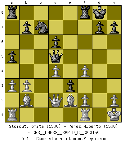 Last move : 0-1 2018 April 17 9:9:45 [Event "FICGS__CHESS__RAPID_C__000150"] [Site "FICGS"] [Date "2018.02.08"] [Round "1"] [White "Stoicut,Tomita"] [Black "Perez,Alberto"] [Result "0-1"] [WhiteElo "1500"] [BlackElo "1500"] 1.b3 e5 2.Bb2 Nc6 3.e3 d5 4.Bb5 Bd6 5.Nf3 f6 6.O-O Nge7 7.c4 O-O 8.cxd5 Nb4 9.Bc4 Bg4 10.Nc3 a5 11.a3 Na6 12.Be2 f5 13.d4 Bxf3 14.Bxf3 e4 15.Be2 Ng6 16.Nb5 Qg5 17.Nxd6 cxd6 18.Qd2 f4 19.g3 Nc7 20.exf4 Nxf4 21.Kh1 e3 22.gxf4 Qxd5 0-1 This chess game has been lost on time (started : 2018.02.08 0:29:5) Nimzovich-Larsen attack : Modern variation Kingside Castling by player White (move 6) Kingside Castling by player Black (move 7) Player Black won this chess game. Follow this game move after move (download)The Pin is mightier than the sword. (Fred Reinfeld) Ich tröste mich mit dem Vergnügen, daß Schachfans, Zuschauer und Leser glücklich sind, wenn ein Großmeister etwas riskiert, statt nur Klötzchen zu schieben. (Mikhail Nekhemyevich Tal) Solo puedes ser bueno en el Ajedrez si amas al juego. (Bobby Fischer) Le pion, dans sa simplicité, marche droit devant lui, mais lorsqu'il prend, il le fait obliquement? Ainsi l'homme, tant qu'il reste pauvre, marche dans la droiture et vit honnêtement, mais lorsqu'il recherche les honneurs, il flatte, se parjure et, par les voies obliques, cherche une position supérieure sur l'échiquier du monde. (Jean de Galles) I find your interest interesting. (Gregory House, House M.D.)