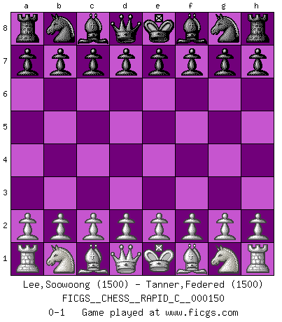 Last move : 0-1 2018 April 19 21:17:0 [Event "FICGS__CHESS__RAPID_C__000150"] [Site "FICGS"] [Date "2018.03.20"] [Round "1"] [White "Lee,Soowoong"] [Black "Tanner,Federed"] [Result "0-1"] [WhiteElo "1500"] [BlackElo "1500"] 0-1 This chess game has been lost on time (started : 2018.03.20 20:7:34) Player Black won this chess game. Follow this game move after move (download)After black's reply to 1.e4 with 1..e5, leaves him always trying to get into the game. (Howard Staunton) Jeder leidlich begabte Spieler, er braucht keineswegs hervorragend veranlagt zu sein, kann es zum Meister bringen. Aber das ist ja auch gar nicht nötig! Der richtige Standpunkt ist es, zu seinem Vergnügen zu spielen, und man glaube ja nicht, dass der Genuss proportional dem Können sei. (Siegbert Tarrasch) Los Peones son nacidos libres, y aún así, se encuentran encadenados por todos lados. (Rick Kennedy) Nous sommes les pions de la mystérieuse partie d'Echecs jouée par Dieu. Il nous déplace, nous arrête, nous pousse encore, puis nous lance un à un dans la boîte du Néant. Epitaphe sur la tombe de David Janowsky (1868-1927). Computers have lots of memory but no imagination. (Anonymous)