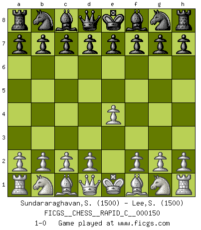 Last move : 1-0 2018 April 20 9:19:44 [Event "FICGS__CHESS__RAPID_C__000150"] [Site "FICGS"] [Date "2018.03.20"] [Round "1"] [White "Sundararaghavan,Shailesh"] [Black "Lee,Soowoong"] [Result "1-0"] [WhiteElo "1500"] [BlackElo "1500"] 1.e4 1-0 This chess game has been lost on time (started : 2018.03.20 20:7:34) King's pawn Opening Player White won this chess game. Follow this game move after move (download)Chess is like war on a board. (Bobby Fischer) Ich kämpfe solange mein Gegner einen Fehler machen kann. (Emanuel Lasker) Hasta este punto, las blancas han seguido un análisis bien conocido. Pero ahora el hace un error fatal: empieza a usar su propia cabeza. (Siegbert Tarrasch) Il n'y a pas eu de défaite parce que je ne crois pas que cet ordinateur ait jamais existé. IBM a triché en refusant d'imprimer les modes de recherche de la machine. C'est évident, pendant le match, des coups décisifs ont été joués par des êtres humains. Aujourd'hui, les meilleurs spécialistes en informatique ne peuvent toujours pas expliquer comment Deep-Blue a pu jouer contre la logique des ordinateurs. IBM a gagné une guerre de communication, mais ils sont incapables de prouver que l'ordinateur a gagné tout seul. (Garry Kasparov) There's no money in correspondence chess. (John Knudsen)