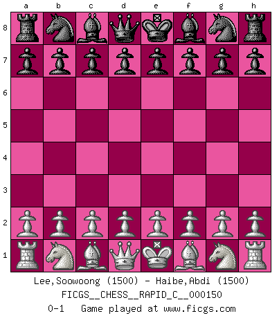 Last move : 0-1 2018 April 19 21:17:0 [Event "FICGS__CHESS__RAPID_C__000150"] [Site "FICGS"] [Date "2018.03.20"] [Round "1"] [White "Lee,Soowoong"] [Black "Haibe,Abdi"] [Result "0-1"] [WhiteElo "1500"] [BlackElo "1500"] 0-1 This chess game has been lost on time (started : 2018.03.20 20:7:34) Player Black won this chess game. Follow this game move after move (download)The essence of Chess is thinking about what Chess is. (David Bronstein) Ich habe Kasparov in Rente geschickt. (Veselin Topalov) Todo se encuentra en un estado de flujo y esto incluye al mundo del Ajedrez. (Mikhail Botvinnik) Une platitude souvent récitée à propos des Echecs est qu'une des choses les plus difficiles à réaliser est de gagner une position gagnante. Cela ne manque pas de sens mais, pour ma part, j'ai toujours trouvé plus difficile de gagner une position perdante. (Tim Krabbe) If you work for a living, why do you kill yourself working ? (Tuco to a chicken in The Good, The Bad and The Ugly)
