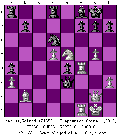 Last move : 1/2-1/2 2007 August 6 20:32:21 [Event "FICGS__CHESS__RAPID_A__000018"] [Site "FICGS"] [Date "2007.04.23"] [Round "1"] [White "Markus,Roland"] [Black "Stephenson,Andrew"] [Result "1/2-1/2"] [WhiteElo "2165"] [BlackElo "2000"] 1.d4 d5 2.e3 Nf6 3.Bd3 c5 4.c3 Nc6 5.f4 Bg4 6.Nf3 e6 7.Nbd2 Bd6 8.O-O cxd4 9.cxd4 O-O 10.a3 Rc8 11.b4 Ne7 12.Bb2 a5 13.b5 Bf5 14.Qe2 Bxd3 15.Qxd3 a4 16.Rac1 Qa5 17.Bc3 Qb6 18.Ne5 Rfd8 19.Bb2 Nf5 20.Nb1 Be7 21.Nc3 Qa5 22.g4 Nd6 23.Qc2 Ra8 24.f5 exf5 25.Qg2 Bf8 26.h3 Nxb5 27.g5 Ne4 28.Nxe4 dxe4 29.Rxf5 Nd6 30.Rf4 Qd5 31.Rcf1 Qb3 32.d5 Qxe3+ 33.R1f2 Qe1+ 34.Rf1 Qe3+ 1/2-1/2 Queen's pawn : Stonewall attack Kingside Castling by player White (move 8) Kingside Castling by player Black (move 9) This chess game ended in a draw. Follow this game move after move (download)When I have White, I win because I am white; When I have Black, I win because I am Bogolyubov. (Bogolyubov) Nur ein wirklich starker Spieler weiß wie schwach er spielt. (Savielly Grigorievitsch Tartakower) Yo he agregado estos principios a la ley: pongan los Caballos en acción antes de que los dos Alfiles sean desarrollados. (Emanuel Lasker) RxDa4 pat (...) Without enthusiasm, virtue functions not at all, and vice only poorly. (Mignon McLaughlin, The Neurotic's Notebook, 1960)