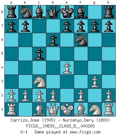 Last move : 0-1 2018 March 22 18:8:43 [Event "FICGS__CHESS__CLASS_B__000265"] [Site "FICGS"] [Date "2018.02.09"] [Round "1"] [White "Carrizo,Jose"] [Black "Nurcahyo,Dery"] [Result "0-1"] [WhiteElo "1945"] [BlackElo "1800"] 1.e4 c5 2.Nc3 d6 3.g3 Nf6 0-1 This chess game has been lost on time (started : 2018.02.09 1:25:16) Sicilian : Closed Player Black won this chess game. Follow this game move after move (download)You need not play well - just help your opponent to play badly. (Genrikh Chepukaitis) Ich verachte Kasparow. (Viktor Kortschnoi) El Ajedrez detiene a su maestro dentro de sus propios vínculos, encadenando la mente y el cerebro, por lo que la libertad interior del mas fuerte debe sufrir. (Albert Einstein) Le génie consiste à savoir transgresser les règles au moment opportun. (Teichmann) Once you start thinking you have nothing left to learn, you have everything to learn. (Steve Badget)