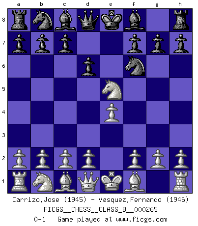 Last move : 0-1 2018 March 21 18:3:50 [Event "FICGS__CHESS__CLASS_B__000265"] [Site "FICGS"] [Date "2018.02.09"] [Round "1"] [White "Carrizo,Jose"] [Black "Vasquez,Fernando"] [Result "0-1"] [WhiteElo "1945"] [BlackElo "1946"] 1.e4 e5 2.Nf3 Nf6 3.Nxe5 d6 0-1 This chess game has been lost on time (started : 2018.02.09 1:25:16) Petrov's defense Player Black won this chess game. Follow this game move after move (download)I have always a slight feeling of pity for the man who has no knowledge of Chess. (Siegbert Tarrasch) Ich habe Kasparov in Rente geschickt. (Veselin Topalov) Botvinnik trató de alejar el misterio referente al Ajedrez, siempre relacionandolo a situaciones de la vida diaria. Solía llamar al Ajedrez un problema inexacto típico, similar a aquellos en que la gente tiene siempre que resolver a cada día. (Garry Kasparov) Mais l'homme est une créature légère et illogique : semblable au joueur d'échecs, il n'aime que le processus du but à atteindre, non le but lui-même. (Dostoïevsky) A belief is an idea the mind possesses, an idea that possesses the mind. (Robert Oxden Bolton)