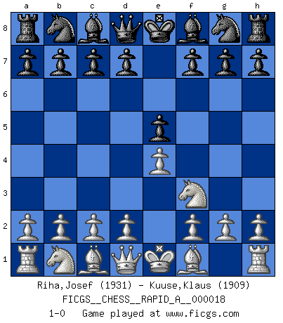 Last move : 1-0 2007 May 24 23:1:40 [Event "FICGS__CHESS__RAPID_A__000018"] [Site "FICGS"] [Date "2007.04.23"] [Round "1"] [White "Riha,Josef"] [Black "Kuuse,Klaus"] [Result "1-0"] [WhiteElo "1931"] [BlackElo "1909"] 1.e4 e5 2.Nf3 1-0 This chess game has been lost on time (started : 2007.04.23 15:25:26) King's knight Opening Player White won this chess game. Follow this game move after move (download)I'm not afraid of Spassky. The world knows I'm the best. You don't need a match to prove it. (Bobby Fischer) Ich hatte Angst gegen einen russischen Großmeister zu verlieren, und er befürchtete gegen einen kleinen Jungen zu verlieren. (über ein Remis gegen Juri Awerbach). (Robert James Fischer) Debió haber existido una vez en que los hombres eran semidióses, de otra manera no hubiesen podido inventar el Ajedrez. (Gustav Schenk) La vie et les Echecs sont tous les deux une lutte constante. (Lasker) The Internet is so big, so powerful and pointless that for some people it is a complete substitute for life. (Andrew Brown)
