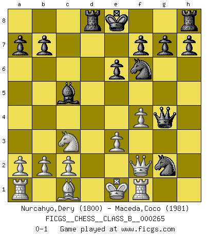 Last move : 0-1 2018 April 10 6:3:35 [Event "FICGS__CHESS__CLASS_B__000265"] [Site "FICGS"] [Date "2018.02.09"] [Round "1"] [White "Nurcahyo,Dery"] [Black "Maceda,Coco"] [Result "0-1"] [WhiteElo "1800"] [BlackElo "1981"] 1.e4 c5 2.f4 d5 3.Bd3 c4 4.Be2 dxe4 5.Bxc4 Nc6 6.Qh5 e6 7.Nc3 Nf6 8.Qe2 Nd4 9.Bb5+ Bd7 10.Bxd7+ Qxd7 11.Qd1 Bc5 12.Nge2 Nf5 13.h3 Qc6 14.g4 Nh4 15.Ng3 e3 16.dxe3 Qg2 17.Rf1 Qxg3+ 18.Ke2 Rd8 19.Qe1 Qxh3 20.Qf2 Qxg4+ 21.Ke1 Ng2+ 0-1 Sicilian : Grand Prix attack Player Black won this chess game. Follow this game move after move (download)Chess is a terrible game. If you have no center, your opponent has a freer position. If you do have a center, then you really have something to worry about ! (Siegbert Tarrasch) Ein Remis kann durch Wiederholung von drei Zügen oder durch einen schlechte Zug erreicht werden. (Savielly Grigorievitsch Tartakower) El estómago es una parte esencial del maestro de Ajedrez. (Bent Larsen) Il vaut mieux sacrifier les pièces de l'adversaire. (Xavier Tartacover) Coffee just isn't my cup of tea. (Unknown)