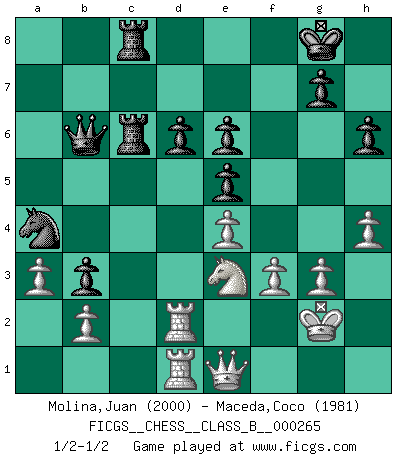Last move : 1/2-1/2 2018 May 7 23:4:37 [Event "FICGS__CHESS__CLASS_B__000265"] [Site "FICGS"] [Date "2018.02.09"] [Round "1"] [White "Molina,Juan"] [Black "Maceda,Coco"] [Result "1/2-1/2"] [WhiteElo "2000"] [BlackElo "1981"] 1.e4 c5 2.Nf3 d6 3.d4 cxd4 4.Nxd4 Nf6 5.Nc3 a6 6.Be3 e5 7.Nf3 Be7 8.Bc4 O-O 9.O-O Be6 10.Bxe6 fxe6 11.Na4 Ng4 12.Qd3 Nxe3 13.Qxe3 b5 14.Nb6 Ra7 15.Nd5 Rb7 16.Nxe7+ Qxe7 17.Rad1 Nd7 18.Rd2 Rc8 19.Rfd1 Rc6 20.c3 a5 21.Ne1 Nf6 22.Nc2 h6 23.f3 Qc7 24.Qe2 b4 25.cxb4 axb4 26.Ne3 b3 27.a3 Nd7 28.g3 Rb8 29.Kg2 Nb6 30.h3 Na4 31.Qe1 Rc8 32.h4 Qb6 1/2-1/2 Sicilian : Najdorf, Byrne (English) attack Kingside Castling by player Black (move 8) Kingside Castling by player White (move 9) This chess game ended in a draw. Follow this game move after move (download)If Chess is a science, it's a most inexact one. If Chess is an art, it is too exacting to be seen as one. If Chess is a sport, it's too esoteric. If Chess is a game, it's too demanding to be just a game. If Chess is a mistress, she's a demanding one. If Chess is a passion, it's a rewarding one. If Chess is life, it's a sad one. (Unknown) Es gibt zwei Arten von Opfern: Korrekte und meine. (Mikhail Nekhemyevich Tal) Todos los jugadores de Ajedrez deberían tener un pasatiempo. (Savielly Tartakower) On est toujours la mazette de quelqu'un d'autre. (Anonyme) Luck is when opportunity knocks and you answer. (Anonymous)