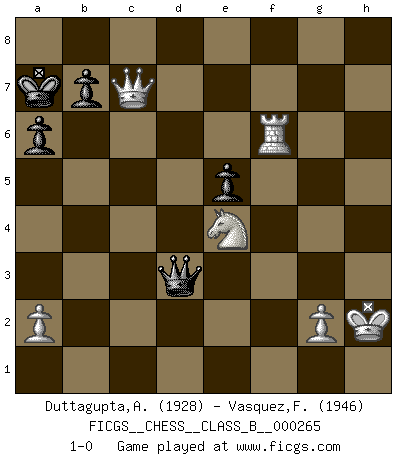 Last move : 1-0 2018 September 30 1:30:50 [Event "FICGS__CHESS__CLASS_B__000265"] [Site "FICGS"] [Date "2018.02.09"] [Round "1"] [White "Duttagupta,Aniruddha"] [Black "Vasquez,Fernando"] [Result "1-0"] [WhiteElo "1928"] [BlackElo "1946"] 1.d4 Nf6 2.Bg5 Ne4 3.Bf4 c5 4.f3 Qa5+ 5.c3 Nf6 6.d5 Qb6 7.e4 Qxb2 8.Nd2 Qxc3 9.Bc7 d6 10.Rb1 Nbd7 11.Ne2 Qe5 12.Nc4 Qh5 13.h4 g6 14.Ba5 g5 15.Ng3 Qg6 16.h5 Qg8 17.Bd3 a6 18.Bb6 Ne5 19.Nxe5 dxe5 20.Qa4+ Nd7 21.O-O g4 22.Bxc5 Qg5 23.Be2 e6 24.Bxf8 Rxf8 25.fxg4 Qe3+ 26.Kh2 Qg5 27.Qa3 h6 28.Rbc1 Qh4+ 29.Kg1 Qd8 30.Rc3 Qb6+ 31.Kh2 Qd8 32.Qc1 Nb6 33.Qxh6 exd5 34.Rb3 Be6 35.Rxb6 Qxb6 36.exd5 O-O-O 37.dxe6 Kb8 38.Rf6 Qc7 39.g5 Rh8 40.Qg7 Rdg8 41.Qxg8+ Rxg8 42.exf7 Rf8 43.g6 Ka7 44.h6 Qe7 45.Ne4 Rh8 46.g7 Rxh6+ 47.Bh5 Rxh5+ 48.Kg1 Rh7 49.g8Q Rxf7 50.Qxf7 Qb4 51.Qh7 Qb1+ 52.Kh2 Qd3 53.Qc7 1-0 Trompowsky attack (Ruth, Opovcensky Opening) Kingside Castling by player White (move 21) Queenside Castling by player Black (move 36) Promotion Queen by player White (move 49) Player White won this chess game. Follow this game move after move (download)Chess is a terrible game. If you have no center, your opponent has a freer position. If you do have a center, then you really have something to worry about ! (Siegbert Tarrasch) Wie ich sie so einen nach dem anderen nieder mähte wurde meine Überlegenheit offensichtlich. (José Raúl Capablanca) Vive, pierde y aprende al observar a tu oponente como ganar. (Amber Steenbock) D'abord les bases : Jouez et étudiez, puis étudiez et jouez, ensuite jouez et étudiez, puis étudiez et jouez. Deuxièmement : Donnez toujours le meilleur de vous-même ! (Ken Smith) Methinks King Thibault should dub Marius Zubac a knight of the square board... I mean table, henceforth addressing him as Sir Marius, and bestow on him a suitable land from the kingdom of FICGS & marry him off to a worthy, fair maiden, lest he slice our heads with his mighty sword in his wrath. (Dinesh De Silva)