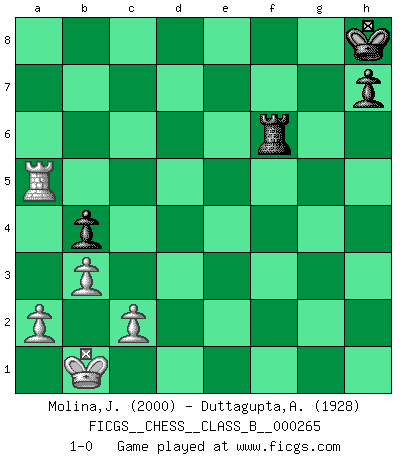 Last move : 1-0 2018 October 29 22:10:38 [Event "FICGS__CHESS__CLASS_B__000265"] [Site "FICGS"] [Date "2018.02.09"] [Round "1"] [White "Molina,Juan"] [Black "Duttagupta,Aniruddha"] [Result "1-0"] [WhiteElo "2000"] [BlackElo "1928"] 1.e4 c5 2.Nf3 d6 3.d4 cxd4 4.Nxd4 Nf6 5.Nc3 Nc6 6.Bg5 e6 7.Qd2 a6 8.O-O-O Bd7 9.f4 b5 10.Bxf6 gxf6 11.Kb1 Qb6 12.Nce2 Rc8 13.Qd3 Be7 14.g4 Rg8 15.h3 b4 16.Rh2 Nxd4 17.Nxd4 a5 18.f5 Rg7 19.Rg2 Kf8 20.Qd2 Kg8 21.fxe6 fxe6 22.b3 Rd8 23.Bc4 d5 24.exd5 exd5 25.Bxd5+ Kh8 26.Qe1 Bf8 27.Re2 Bxg4 28.hxg4 Rxd5 29.Ne6 Rxd1+ 30.Qxd1 Rf7 31.Nxf8 Rxf8 32.Re7 Qd8 33.Rd7 Qe8 34.g5 Qg6 35.Qd6 Kg8 36.Qe6+ Kh8 37.Qe7 Rc8 38.Qxf6+ Qxf6 39.gxf6 Rf8 40.Ra7 Rxf6 41.Rxa5 1-0 Sicilian : Richter-Rauzer, Rauzer attack, 7...a6 Queenside Castling by player White (move 8) 10 pieces endgame at move 40 : White KRPPP , Black KRPPP WHITE : King + 1 Rook 3 Pawns BLACK : King + 1 Rook 3 Pawns 9 pieces endgame at move 41 : White KRPPP , Black KRPP WHITE : King + 1 Rook 3 Pawns BLACK : King + 1 Rook 2 Pawns Player White won this chess game. Follow this game move after move (download)Chess is the art of analysis. (Mikhail Botvinnik) Kein Schachspieler kann gut schlafen. (H. G. Wells) El Ajedrez es un invernadero donde los frutos del carácter pueden madurar mas completamente que en la vida. (Edward Morgan Foster) J'ai toujours senti une vague pitié pour l'homme qui ne connaît rien aux échecs, tout comme j'en aurais pour un homme ignorant de l'amour. Les Echecs, comme la musique ou comme l'amour, ont le pouvoir de rendre heureux. (Siegbert Tarrasch) It is not enough to be a good player... you must also play well. (Siegbert Tarrasch)