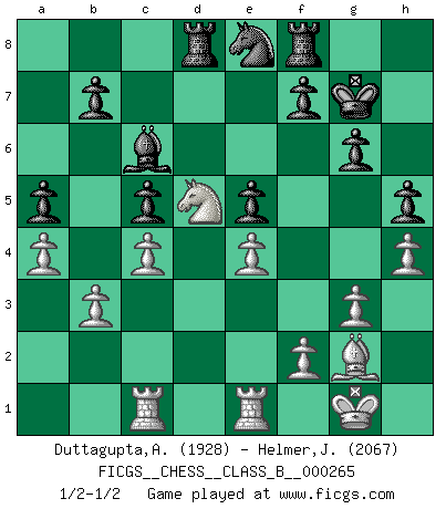 Last move : 1/2-1/2 2018 June 15 10:37:22 [Event "FICGS__CHESS__CLASS_B__000265"] [Site "FICGS"] [Date "2018.02.09"] [Round "1"] [White "Duttagupta,Aniruddha"] [Black "Helmer,Janos"] [Result "1/2-1/2"] [WhiteElo "1928"] [BlackElo "2067"] 1.c4 Nf6 2.Nc3 g6 3.g3 Bg7 4.Bg2 O-O 5.e4 c5 6.Nge2 Nc6 7.O-O d6 8.d3 a6 9.h3 Bd7 10.a4 Ne8 11.Be3 Rb8 12.d4 cxd4 13.Nxd4 Nxd4 14.Bxd4 Rc8 15.Nd5 Bxd4 16.Qxd4 e5 17.Qd3 a5 18.Rfd1 Bc6 19.Ne3 Qb6 20.Qa3 Qc5 21.h4 Kg7 22.b3 Nf6 23.Qxc5 dxc5 24.Nd5 Rcd8 25.Rac1 Ne8 26.Re1 h5 1/2-1/2 English Opening Kingside Castling by player Black (move 4) Kingside Castling by player White (move 7) This chess game ended in a draw. Follow this game move after move (download)The King is a fighting piece. Use it ! (Wilhelm Steinitz) Ich hatte Zahnschmerzen im ersten Spiel. In der zweiten Partie tat mir der Kopf weh. In der dritten war es eine Rheuma-Attacke und während der vierten fühlte ich mich nicht gut. Und in der fünften? Nun, man muss doch nicht jedes Spiel gewinnen, oder? (Savielly Grigorievitsch Tartakower) Cuando tu casa esta en llamas, no puedes ser molestado por tus vecinos. O, como decinos en Ajedrez, si tu Rey esta bajo ataque, no te preocupa perder un Peón del lado de la Reina. (Gary Kasparov) Le génie consiste à savoir transgresser les règles au moment opportun. (Teichmann) The next best thing to gambling and winning is gambling and loosing. (Nick Dandalos)