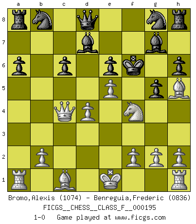 Last move : 1-0 2018 February 22 11:45:8 [Event "FICGS__CHESS__CLASS_F__000195"] [Site "FICGS"] [Date "2018.02.10"] [Round "1"] [White "Bromo,Alexis"] [Black "Benreguia,Frederic"] [Result "1-0"] [WhiteElo "1074"] [BlackElo "0836"] 1.d4 d5 2.c4 dxc4 3.Nc3 a6 4.e4 b5 5.a4 bxa4 6.Qxa4+ Bd7 7.Qxc4 g6 8.Nf3 Bg7 9.Ng5 e6 10.Nd5 h6 11.Nxf7 Kxf7 12.Be2 c6 13.Nf4 g5 14.Bh5+ Kf6 15.e5+ 1-0 Queen's gambit accepted Player White won this chess game. Follow this game move after move (download)Discovered check is the dive bomber of the Chessboard. (Reuben Fine) Ich habe die besten Aussichten, den ersten Preis zu gewinnen - denn jeder muss gegen Steinitz spielen, nur ich nicht! (Wilhelm Steinitz) En la perfecta combinación de Ajedrez como en una historia corta de primera clase, toda la trama y contra trama deberá conducir hacia un final sorprendente, el interes no es mitigado hasta el último momento. (Yates and Winter) Toutes choses étant égales, c'est la conviction qui gagne. Alliée à une volonté de vaincre, elle sert de détonateur, suscite des idées, disperse les doutes et aide à penser clairement. (Robert Fischer) You must do what you feel is right... of course. (Obi-Wan Kenobi in Star Wars ep.4)
