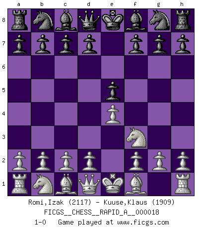 Last move : 1-0 2007 May 26 11:10:7 [Event "FICGS__CHESS__RAPID_A__000018"] [Site "FICGS"] [Date "2007.04.23"] [Round "1"] [White "Romi,Izak"] [Black "Kuuse,Klaus"] [Result "1-0"] [WhiteElo "2117"] [BlackElo "1909"] 1.e4 e5 2.Nf3 1-0 This chess game has been lost on time (started : 2007.04.23 15:25:26) King's knight Opening Player White won this chess game. Follow this game move after move (download)The tactician knows what to do when there is something to do; whereas the strategian knows what to do when there is nothing to do. (Gerald Abrahams) Es gibt keine einzige Frau, der ich nicht einen Springer vorgeben könnte und trotzdem gewänne. (Robert James Fischer) El Ajedrez es la vida. (Bobby Fischer) Lorsque vous vous retrouvez devant une position atroce, ne tendez pas un ultime piège dérisoire avec l'intention d'abandonner si l'adversaire le déjoue ! Faites-vous plutôt un devoir de résister comme si votre vie en dépendait. Jouez le coup qui vous déplairait au centuple si vous étiez dans la peau de votre tortionnaire ! Now be brave and don't look back. Don't look back. (Shmi Skywalker in Star Wars ep.1)