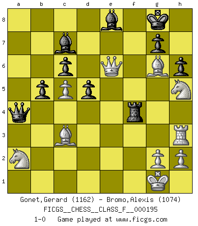 Last move : 1-0 2018 February 13 15:26:42 [Event "FICGS__CHESS__CLASS_F__000195"] [Site "FICGS"] [Date "2018.02.10"] [Round "1"] [White "Gonet,Gerard"] [Black "Bromo,Alexis"] [Result "1-0"] [WhiteElo "1162"] [BlackElo "1074"] 1.d4 d5 2.e4 c6 3.c4 h6 4.Nc3 e6 5.e5 Bb4 6.Nge2 Ne7 7.a3 Ba5 8.b4 Bb6 9.c5 Bc7 10.f4 b6 11.Ng3 b5 12.Bd3 a5 13.Bb2 axb4 14.axb4 Rxa1 15.Bxa1 Na6 16.Na2 O-O 17.O-O Bd7 18.Qg4 f5 19.exf6 Rxf6 20.Nh5 Rf7 21.Bc3 Nf5 22.Rf3 Be8 23.Rh3 Nxb4 24.Bxb4 Qa8 25.Bb1 Qa4 26.Bc3 Nxd4 27.Bg6 Ne2+ 28.Qxe2 Rxf4 29.Qxe6+ 1-0 Blackmar gambit Kingside Castling by player Black (move 16) Kingside Castling by player White (move 17) Player White won this chess game. Follow this game move after move (download)There are two types of sacrifices: correct ones and mine. (Mikhail Tal) Wenn ich gewinne bin ich ein Genie. Wenn nicht, dann bin ich keines. (Robert James Fischer) Todo lo que importa ante el tablero de Ajedrez son buenas jugadas. (Bobby Fischer) La vérité est comme le meilleur coup aux échecs : elle existe, mais il faut la chercher. (Arturo Perez-Reverte) The general who wins the battle makes many calculations in his temple before the battle is fought. The general who loses makes but few calculations beforehand. (Sun Tzu)
