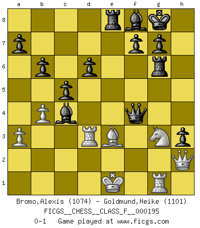 Last move : 0-1 2018 March 17 20:41:27 [Event "FICGS__CHESS__CLASS_F__000195"] [Site "FICGS"] [Date "2018.02.10"] [Round "1"] [White "Bromo,Alexis"] [Black "Goldmund,Heike"] [Result "0-1"] [WhiteElo "1074"] [BlackElo "1101"] 1.d4 Nf6 2.c4 b6 3.Nc3 Bb7 4.Nf3 e6 5.a3 c5 6.e3 d6 7.h3 Be7 8.Be2 Ne4 9.Nxe4 Bxe4 10.O-O Nd7 11.Bd3 Bb7 12.Re1 Nf6 13.b3 Ne4 14.Bb2 O-O 15.d5 exd5 16.Bxe4 dxe4 17.Nd2 Re8 18.Qg4 Bf8 19.Rad1 Bc8 20.Qg3 Bf5 21.f4 Re6 22.b4 Rg6 23.Qh2 Qh4 24.g4 h5 25.Nf1 hxg4 26.Ng3 gxh3 27.Kf2 Qg4 28.Rg1 Qf3+ 29.Ke1 Qxe3+ 30.Kf1 Qxf4+ 31.Ke1 Be6 32.Bc1 e3 33.Rd3 Bxc4 34.Bxe3 Re8 0-1 Queen's Indian Accelerated Kingside Castling by player White (move 10) Kingside Castling by player Black (move 14) Player Black won this chess game. Follow this game move after move (download)I have never in my life played the French Defence, which is the dullest of all openings. (Wilhelm Steinitz) Gott hat gewollt, dass ich Champion werde. (Surab Azmajparaschvili) Aquellos que dicen entender al Ajedrez, no entienden nada. (Robert Hubner) La menace est plus forte que l'exécution. (Aaron Nimzovitch) Creativity is inventing, experimenting, growing, taking risks, breaking rules, making mistakes, and having fun. (Mary Lou Cook)
